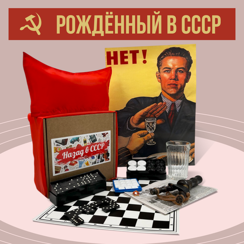 В комплект винтажного «СССР» вошли легендарные вещи и «настолки» того времени: галстук и пилотка пионера, значок «Всегда готов!», шашки с полем для игры, пятнашки, домино, граненый стакан, рогатка, плакат «Нет!», газета «Комсомольская правда».