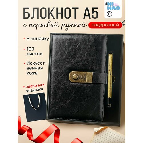 Подарочный набор сочетает современный дизайн и функциональность. Черный матовый блокнот с кодовым замком обеспечивает конфиденциальность записей, а золотая ручка с перьевым наконечником добавляет элегантности. Формат A5 идеально подходит для заметок, планирования или творчества благодаря 100 плотным листам в линейку.