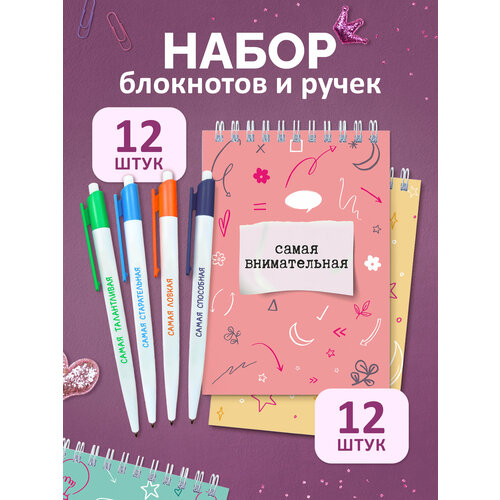 Подарочный комбо-набор «Самая» состоит из 12 блокнотов и 12 ручек с тематическим дизайном