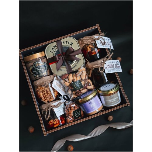 Подарочный набор упакован в стильную деревянную коробку, перевязанную широкой атласной лентой. Это делает его не только вкусным, но и эстетически приятным подарком.