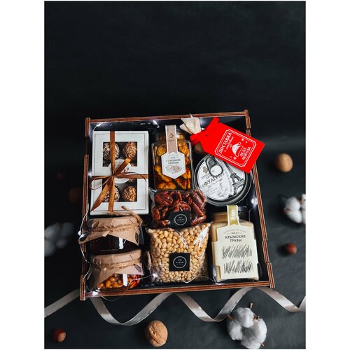 В состав набора входят трюфельные конфеты, фуагра из гусиной печени, множество полезных вкусностей как на фото, варенье из сосновой шишки, кедровый орех в сосновом сиропе, орех пекан, конфеты ручной работы с орехами. Все эти деликатесы из дичи упакованы в стильную деревянную коробку, которая обвязана атласной лентой.