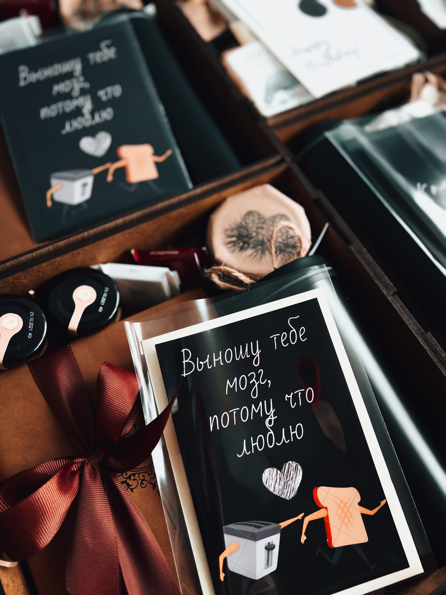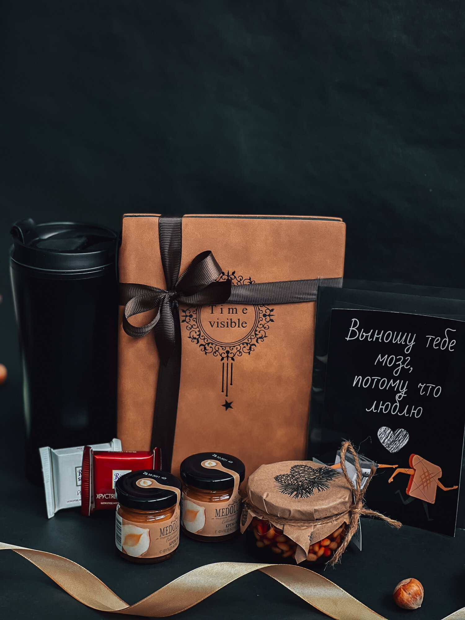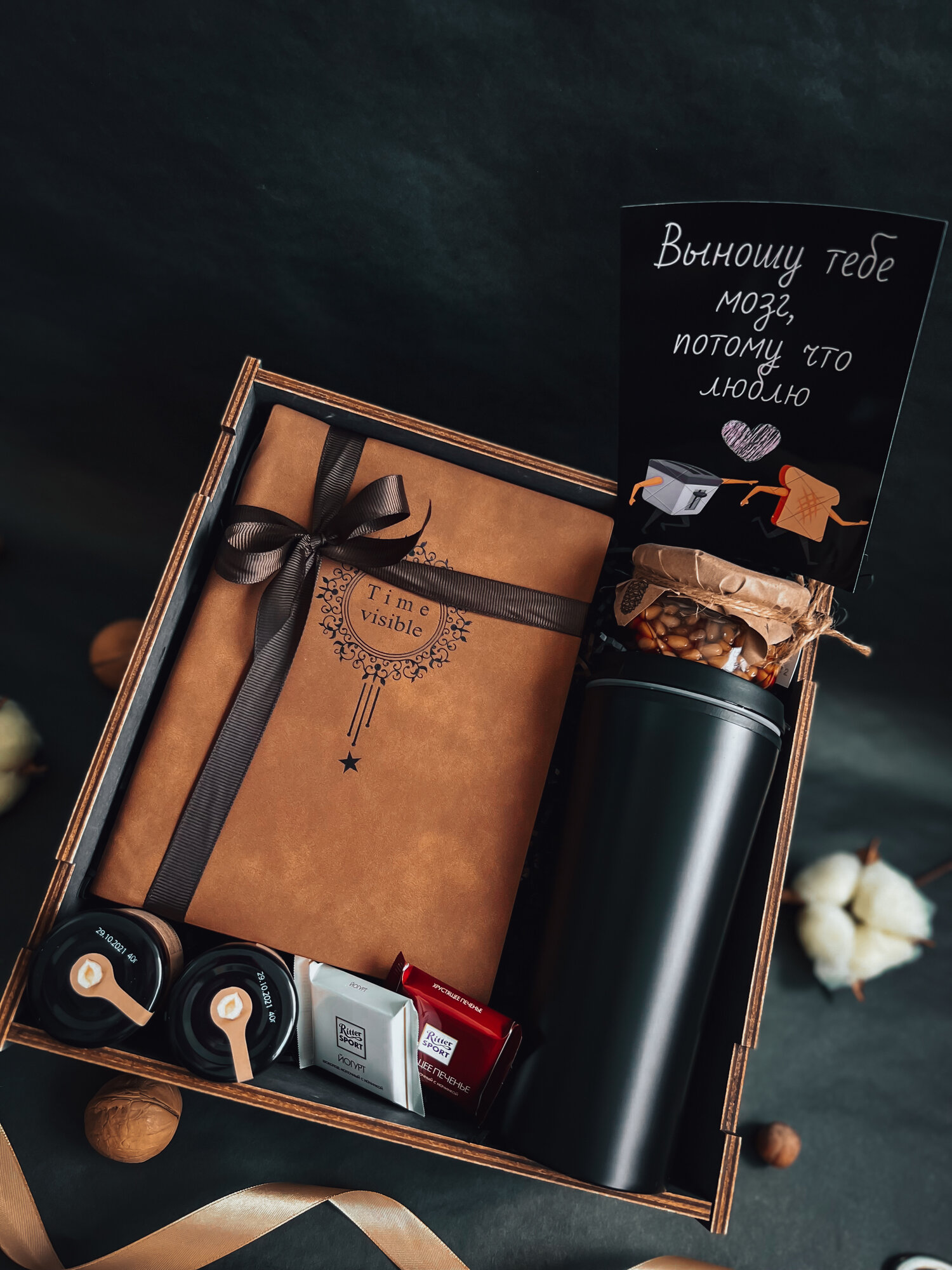В составе данного подарочного набора :- Бумажный наполнитель;- атласная лента;- деревянная коробка с гравировка на крышке 1 шт.;- термокружка черная 450мл. 1шт.;- кедровый орех в сосновом сиропе 120 гр. 1шт.;- крем мед с фундуком 40 мл. 2 шт.- шоколад ritter sport mini 2 шт.- дизайнерская открытка- ежедневник недатированныйЭтот бокс полон вкусностей и полезностей, он идеально подойдет как подарок мужу или подарок парню. Подарочный бокс от BonMarcheSpb - это подарок, который вызывает восторг. Упаковка подарочная - деревянная коробка с гравировкой "Кому-то особенному", лента атласная коричневая. Ваш любимый/коллега/близкий получит незабываемые эмоции от этого оригинального подарка и еще долго будет им пользоваться.