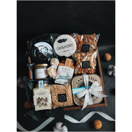 Подарочный набор Bon Marche Spb - это изысканный и премиальный подарок для мужчин на любой праздник. В состав набора входят деликатесы из дичи, мясные деликатесы, конфеты, полезные вкусности, чай, ореховые пасты, пряник и подарочная упаковка.