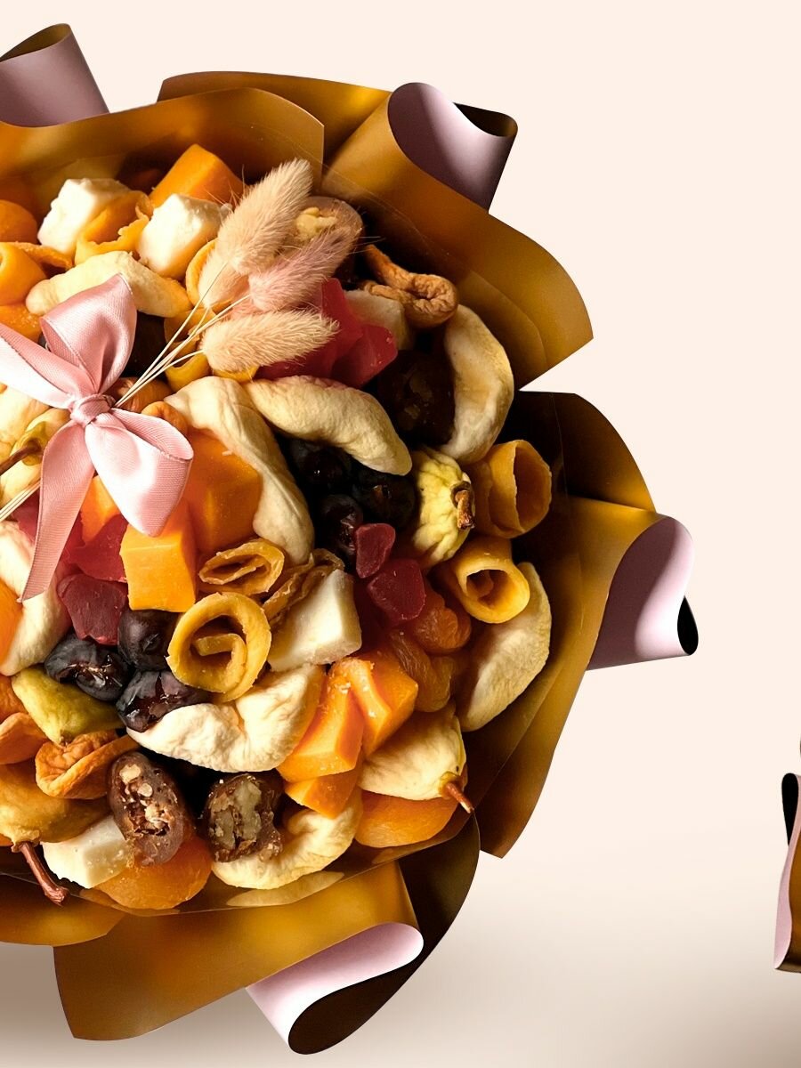 Ищете оригинальный и универсальный подарок? Хотите не просто порадовать, а ещё и подарить пользу? Любите удивлять и дарить бесценные эмоции? Присмотритесь к съедобному букету из сухофруктов от компании studio handwork. Подарочный набор букет из сухофруктов в подарок создаст атмосферу праздника даже в самый обычный день. Вкусные подарки - это прекрасный и оригинальный подарок, который сочетает в себе вкус и эстетику. Наш сладкий букет приятно удивит не только взрослых, но и станет отличным подарком для самых маленьких детей. Ведь он содержит в своем составе отборные сухофрукты