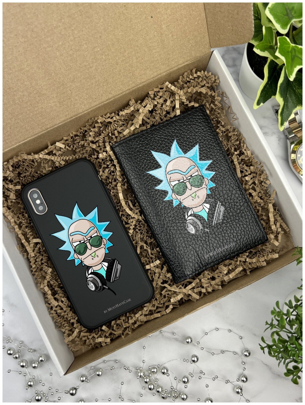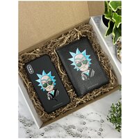 Купить Подарочный набор: Черный силиконовый чехол для iPhone X/Xs/ Айфон 10/10С + Черная кожаная обложка на паспорт Rick Рик и Морти с доставкой по всей России.