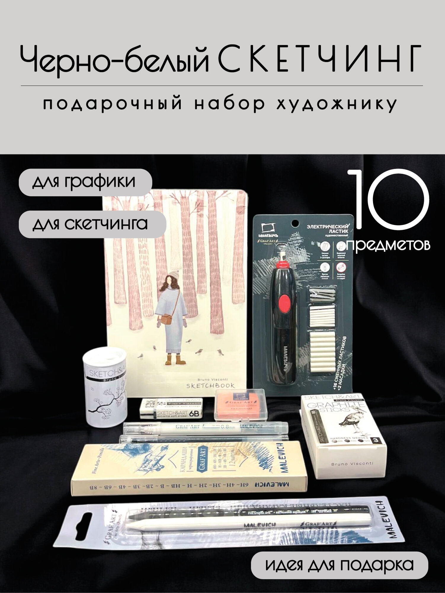 Подарочный набор для художника "Черно-белый скетчинг" от Bruno Visconti - это профессиональный набор для скетчинга и дизайна, состоящий из 10 предметов.