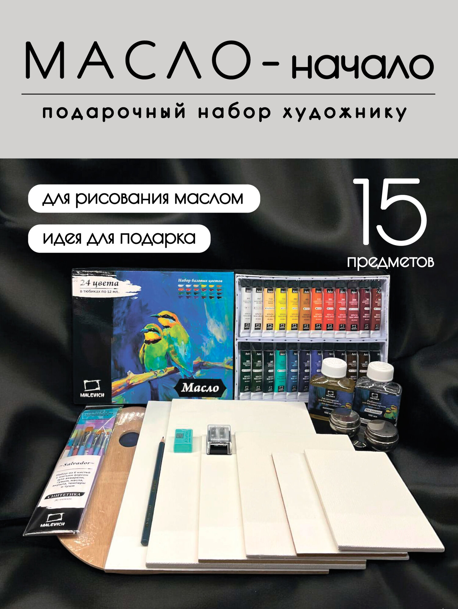 Подарочный набор для художника "Масло - начало" от бренда Малевичъ - это набор из 15 предметов, который станет отличным подарком для любого начинающего или профессионального художника.