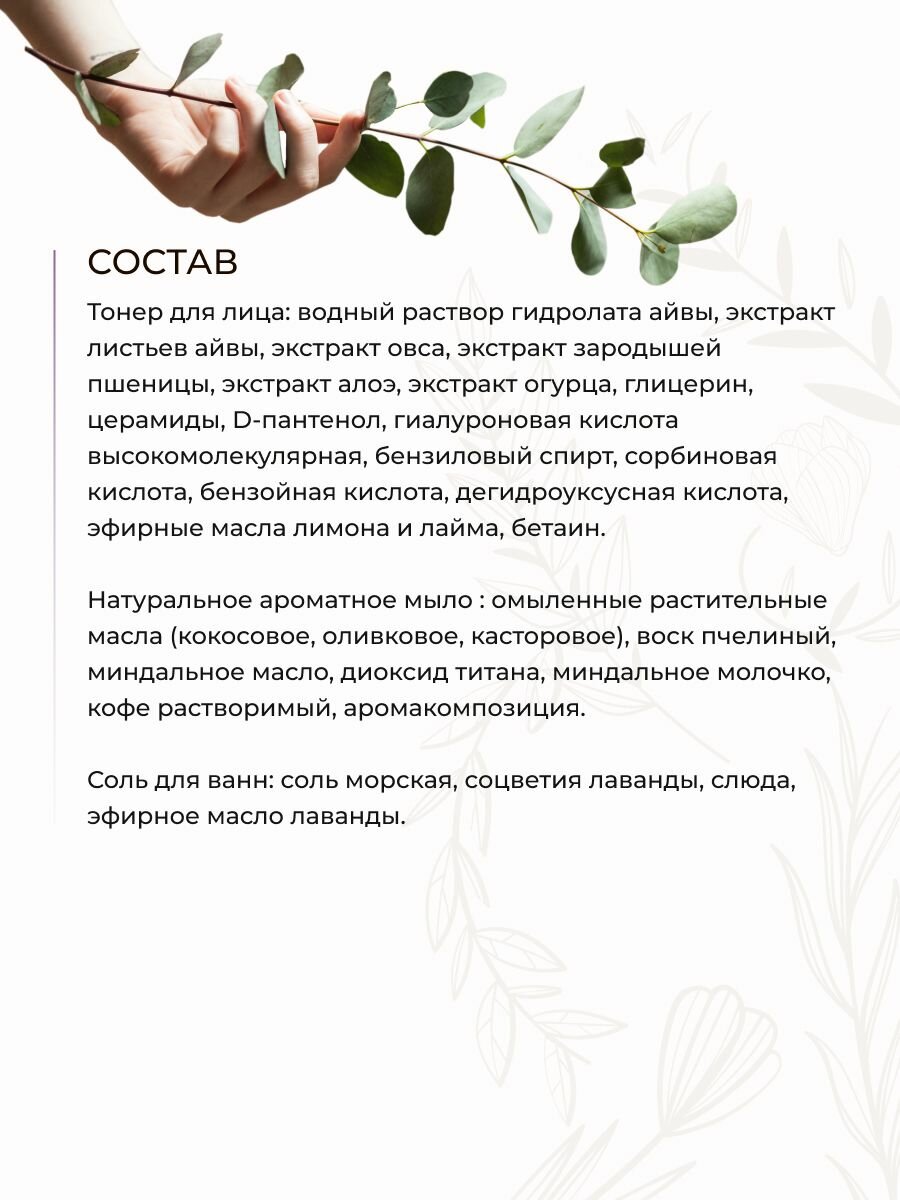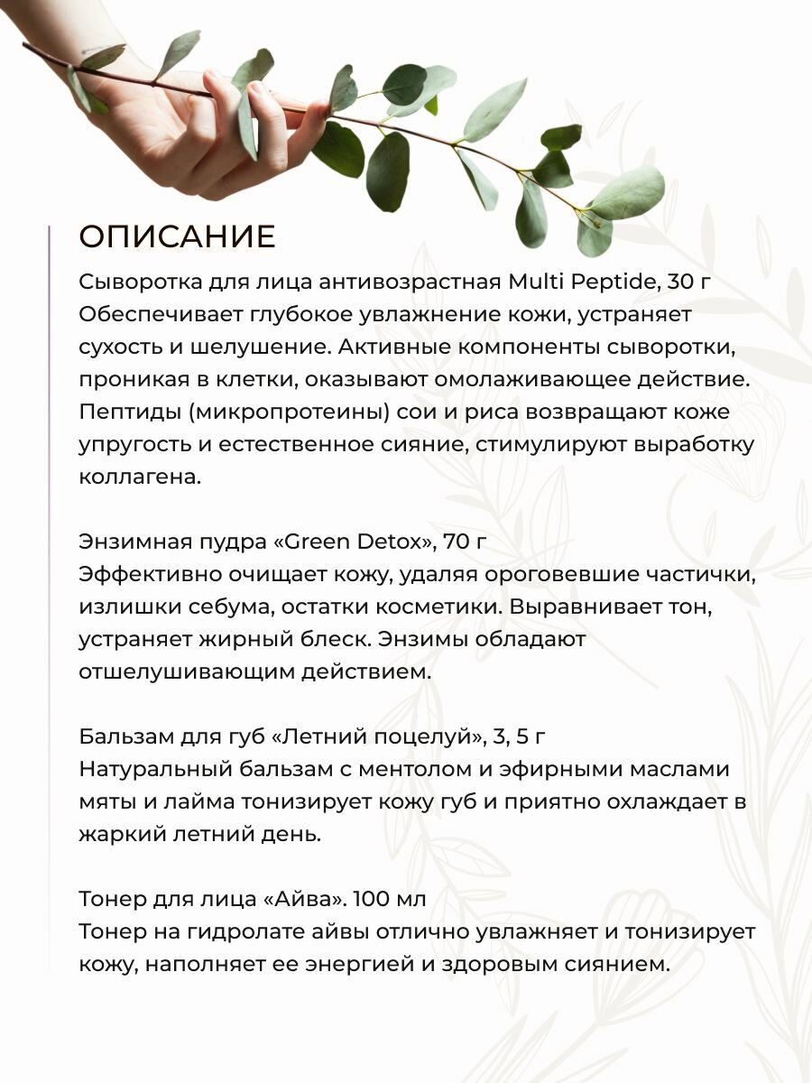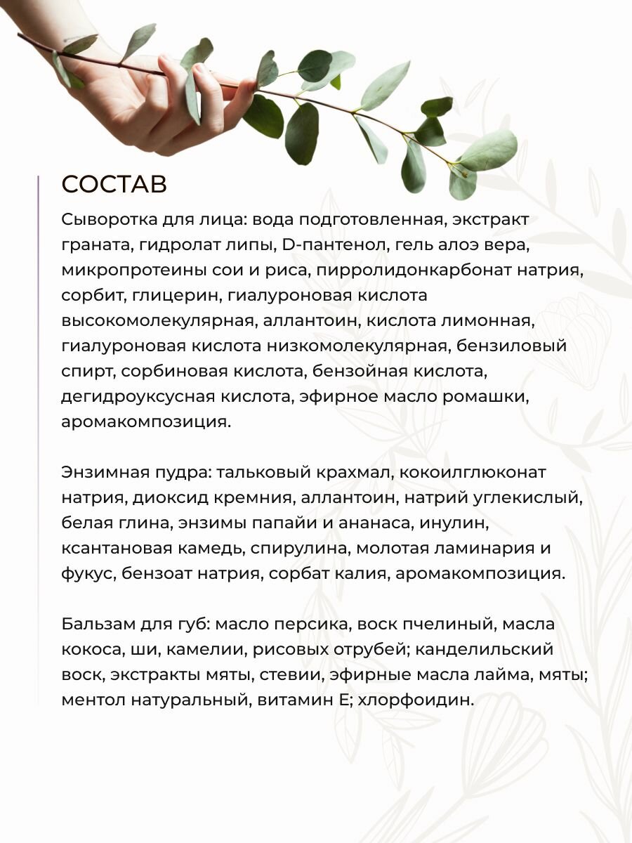 Сыворотка для лица: нанести на чистую кожу лица. Энзимная пудра: вспенить средство и массажными движениями нанести на влажную кожу, избегая области вокруг глаз. Смыть водой. Тонер для лица: нанести на слегка влажную очищенную кожу лица, распределить легкими похлопывающими движениями. Соль для ванн : саше-мешочек с солью добавить в теплую воду. Принимать ванну 15-20 минут.