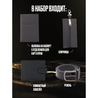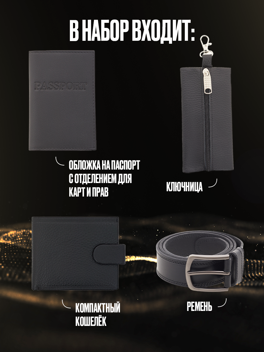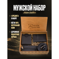 Подарочный набор для мужчин. Подарок мужчине на 23 февраля, новый год, день рождения, 14 февраля. Мужские подарочные наборы позволят Вам сэкономить время на поиске идеального подарка. Все что необходимо уже входит в мужской набор и выполнено из натуральной кожи высокого качества, такого подарка достоин только настоящий мужчина. 1) Черный классический кожаный натуральный мужской ремень отлично подойдет как для брюк, так и для джинс. Длинна ремня 120см и легко корректируется простым срезом ножниц. 2) Мужской кожаный маленький кошелек с отделением для карт выглядит очень стильно и подчеркнет статус и хороший вкус его владельца. Мужское кожаное портмоне с легкостью помещается в кармане джинс, брюк. 3) Кожаная обложка на паспорт с карманами для карт. 4) Карманная мужская кожаная ключница с карабином. Подарочный набор мужчине поставляется в презентабельной деревянной коробке, вручать такой презент одно удовольствие. Это отличный подарок другу, коллеге, любимому, папе, дедушке, мужу.