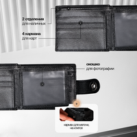 - Кошелек выполнен в классическом стиле из качественной экокожи. Компактный и в то же время очень практичный. Размер кошелька 11 см на 8,5 см. Для мелочи есть специальный карман закрывающийся на клипсу. Рядом расположено окошко для фотографии. Для карт есть 4 кармана, справа можно положить документы от авто или еще одну фотографию. Для наличных 2 отделения.