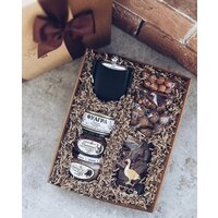 Эффектный и стильный набор с отменными ингредиентами подарит бурю положительных эмоций получателю. В составе этого оригинального набора: фуагра из гусиной печени, оленина томлёная с таёжными ягодами и шалфеем, кабан с можжевеловыми ягодами и розмарином, мясо сушенное "Деликатес дичи", металлическая фляжка в чехле, фундук в скорлупе, орешки макадамия, пряные орешки с клюквой, открытка, фирменный декор и подарочная упаковка Размеры бокса 32х20х10см Все это оформлено в экологичной крафтовой коробочке из плотного картона, украшено фирменным шубером с золотым тиснением и благородной репсовой лентой. Мы заботимся о бережной доставке, поэтому все наборы дополнительно упакованы в слой пупырчатой пленки и дополнительную защитную коробку, для 100% сохранности подарка!