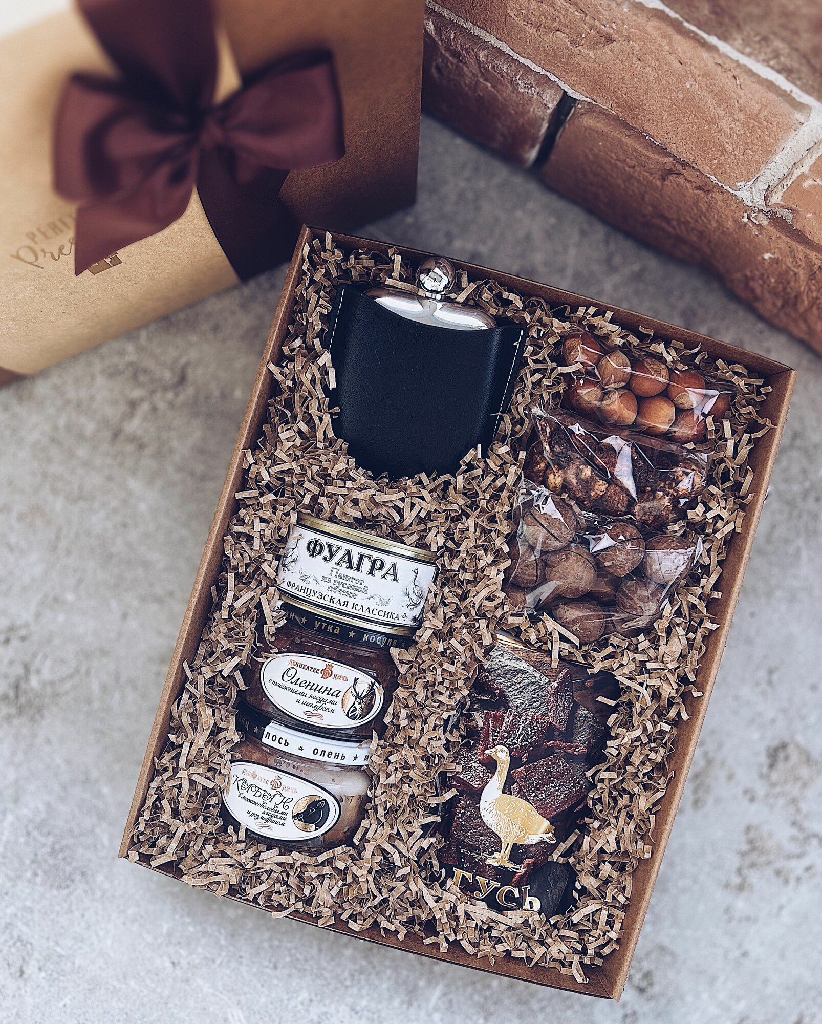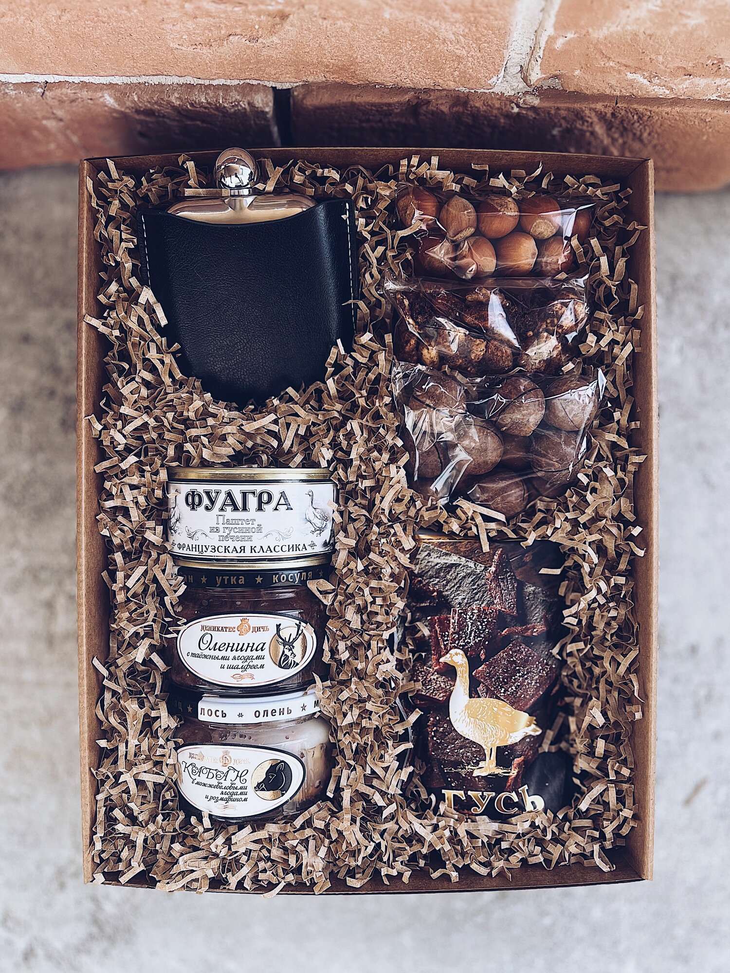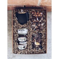 фуагра из гусиной печени, оленина томлёная с таёжными ягодами и шалфеем, кабан с можжевеловыми ягодами и розмарином, мясо сушенное "Деликатес дичи", металлическая фляжка в чехле, фундук в скорлупе, орешки макадамия, пряные орешки с клюквой, открытка