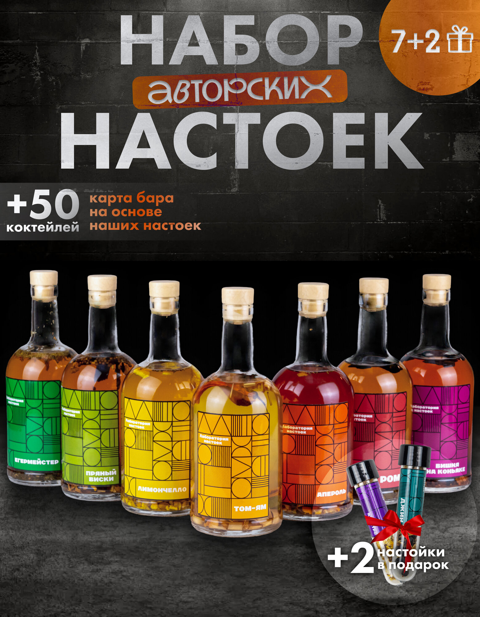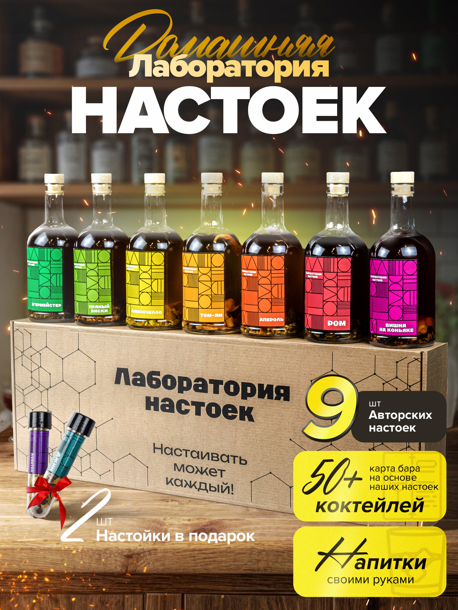 Эксклюзивный набор для настаивания “Лаборатория настоек” включает 7 стеклянных бутылей с наполнением. Ощутите мягкое и богатое послевкусие и яркий травяной букет сложного бальзама Егермейстера, фруктовый с сухими пряными нотами Виски, экзотический аромат и острый вкус тайской перцовки Том-Ям, древесный дымный привкус Рома, яркий насыщенный - Вишни на коньяке, освежающий бриз Лимончелло, пикантный аромат Джина, сладкий апельсиновый драйв ликера Куантро, необычные нотки Блю Кюрасао, пикантный вкус сладко-горького Апероля. Напрямую от производителя.