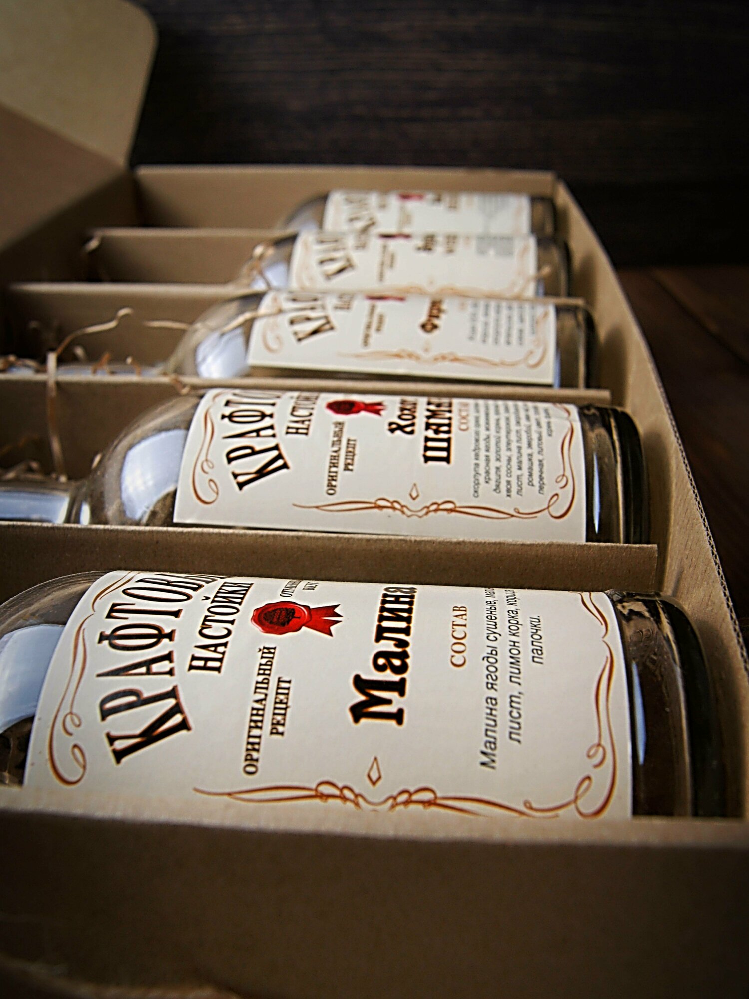 Бутылки с готовыми заготовками - сухими смесями - размещены в оригинальной картонной упаковке - коробке с наполнителем крафт бумагой - вручную, с любовью. На боксе из гофры - креативная дизайнерская надпись.