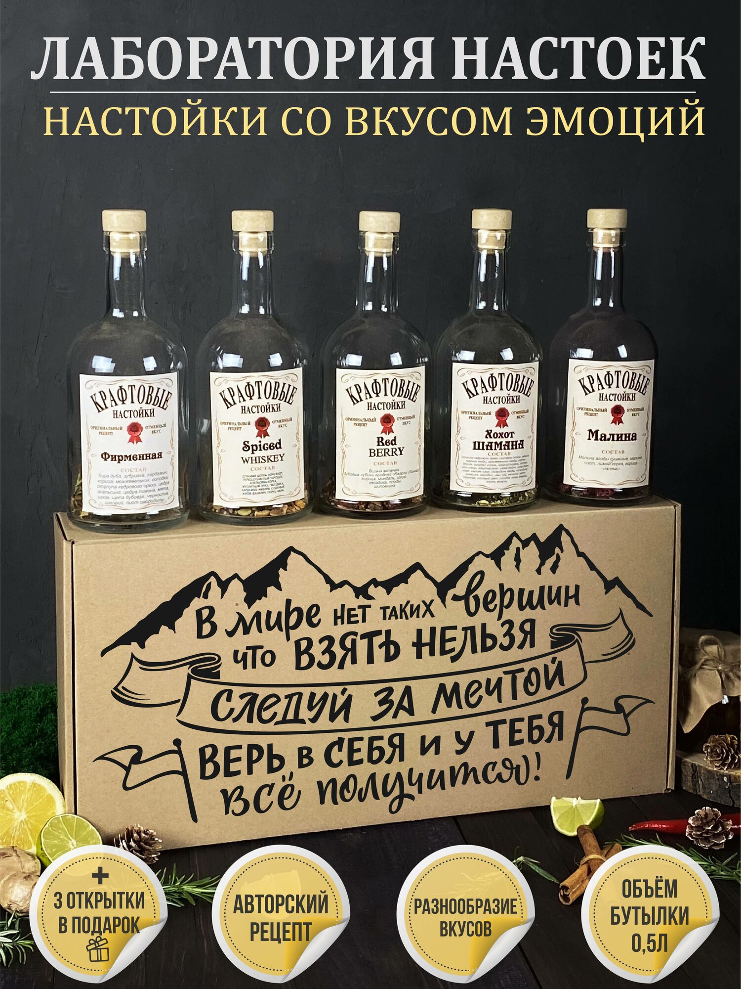 Пять бутылей из прозрачного стекла продемонстрируют волшебные оттенки этого ассорти из натуральных ингредиентов - ягод, специй, грецкого и кедрового ореха, коры, кореньев, трав. На каждой бутылочке - наклейка этикетка с надписью. В наборе - инструкции с рецептами. Красивые мужские и женские напитки точно понравятся вам и вашим близким.