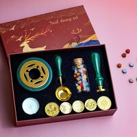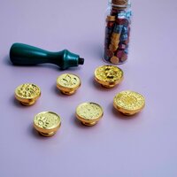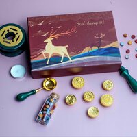 Подарочный набор для создания сургучной печати : -деревянная ручка для штампов 1шт. -ложка для плавления сургуча с деревянной ручкой 1шт. -свеча 1шт. -деревянная сургучница для плавления сургуча 1шт. -штамп 6шт. -набор разноцветного сургуча в стеклянной банке 50 капсул -подарочная коробка 20см*15см*4см
