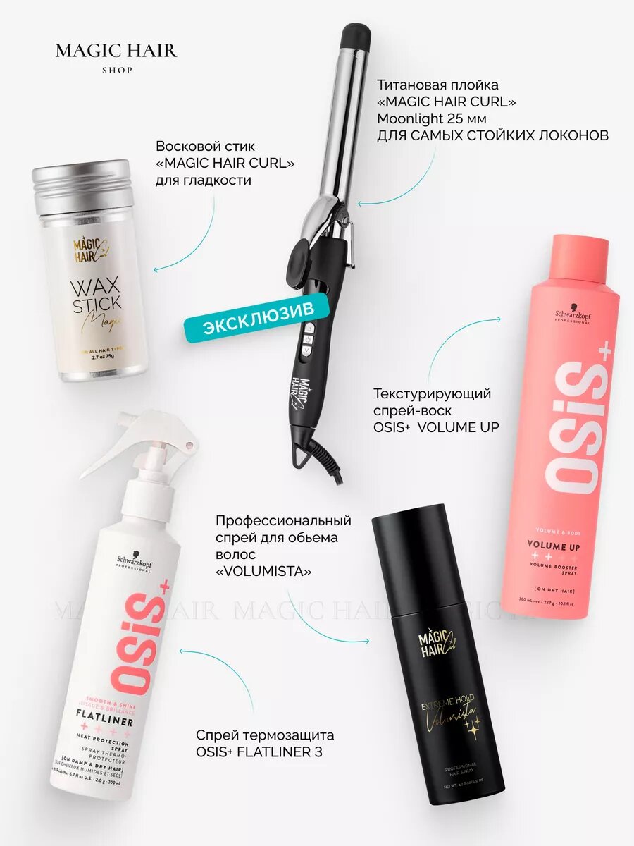 Не знаете какой оригинальный подарок подарить девушке? Подарочный набор для волос отличная идея подарка на 14 февраля, 8 марта и день рождения. Бьюти бокс включает в себя следующий стайлинг: 1) Osis+ Volume Up, спрей-воск текстурирующий 300 мл; 2) MAGIC WAX STICK, восковой стик для разглаживания и текстуры 75 г ; 3) Magic Hair Curl Volumista спрей для объёма 120мл; 4) Профессиональная плойка для волос с гальваническим покрытием; 5) Osis+ Flatliner 3, спрей-термозащита легкая фиксация 200 мл. Косметический набор для локонов имеет в наборе 5 различных средства. Бокс с косметикой ( Beauty Box ) всегда актуален для женщин, девочек и стилистов. Отличный подарок на любой праздник для любимой дочки, подруги и мамы. Наш новый бьюти - бокс не только позволит ознакомиться с новинками средств для укладки, но также поможет в короткий срок преобразить волосы и сделать прическу. Красивые, уложенные волосы - ваше лучшее украшение!