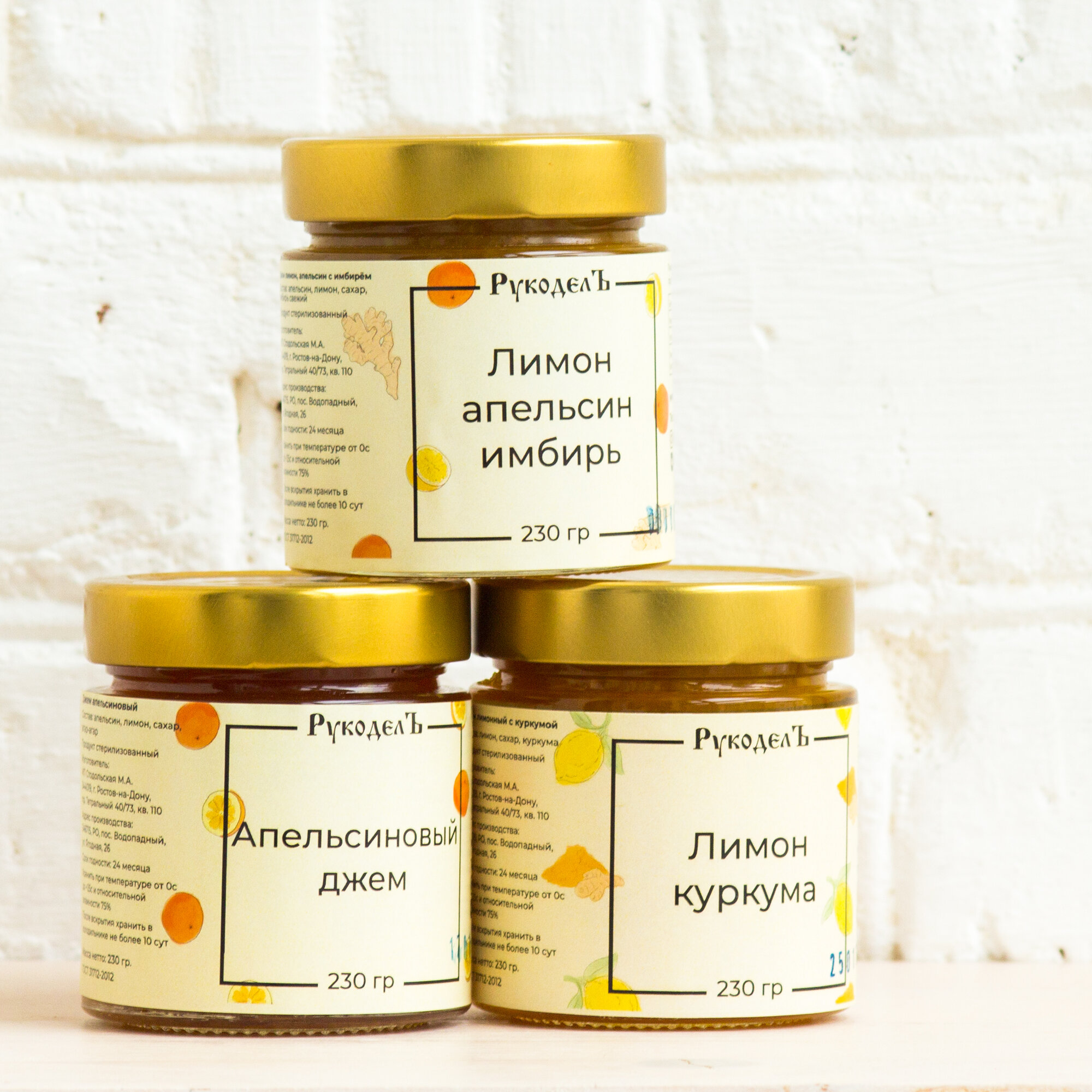| Состав | В состав набора входит: Джем апельсиновый Состав: Апельсин, лимон, сахар, загуститель агар-агар Джем Лимон/апельсин/имбирь Состав: Апельсин, лимон, сахар, имбирь натуральный Джем Лимонный с куркумой Состав:Лимон, сахар, куркума натуральная |