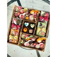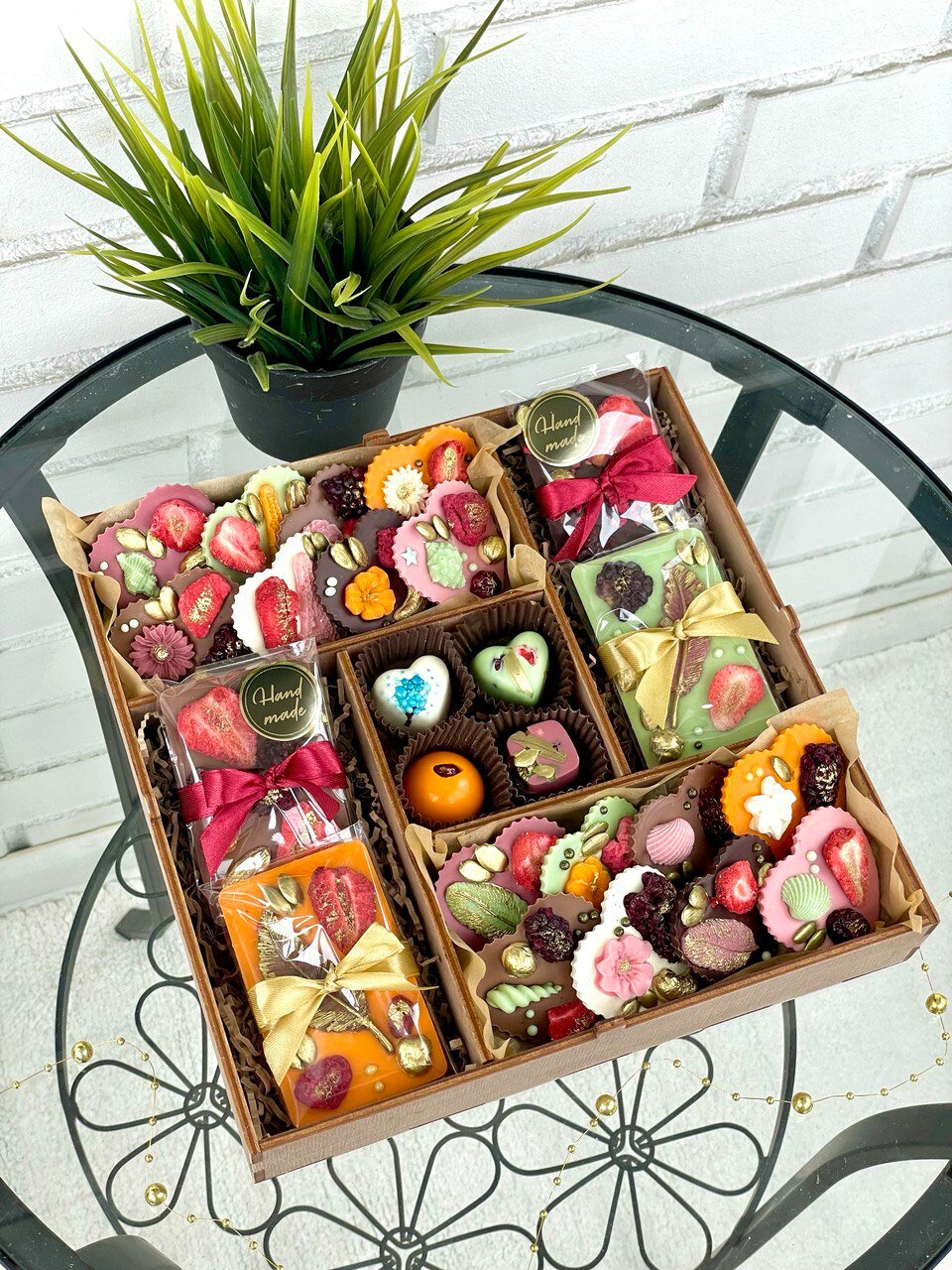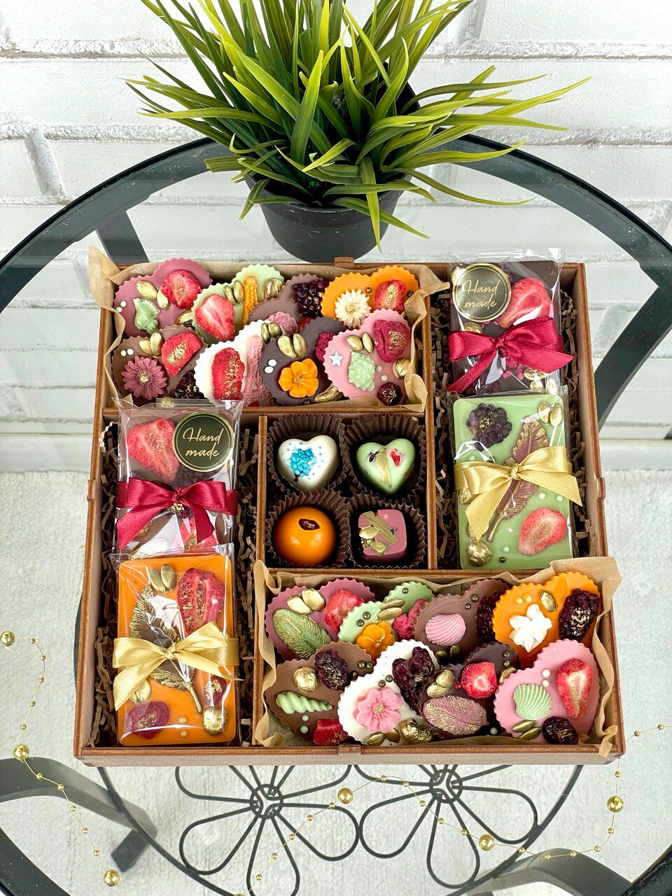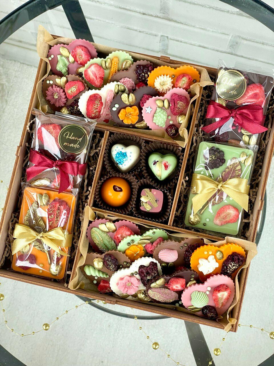 Внутри набора: ▪️медианты ручной работы из: -молочного, -тёмного, -белого, -лимонного, -апельсинового, -рубинового шоколада с добавлением цельных орехов, сублимированных ягод, тыквенных семечек, воздушного риса и сушёной клюквы. ▪️4 шоколадки ручной работы из молочного, темного, лимонного и апельсинового Бельгийского шоколада. ▪️4конфеты ручной работы из апельсинового, рубинового, белого и лимонного шоколада. Внутри конфет цельные орехи, тыквенные семечки, сушеная клюква и воздушный рис. Сверху украшено золотым пищевым кандурином. Вес шоколада в наборе 470гр