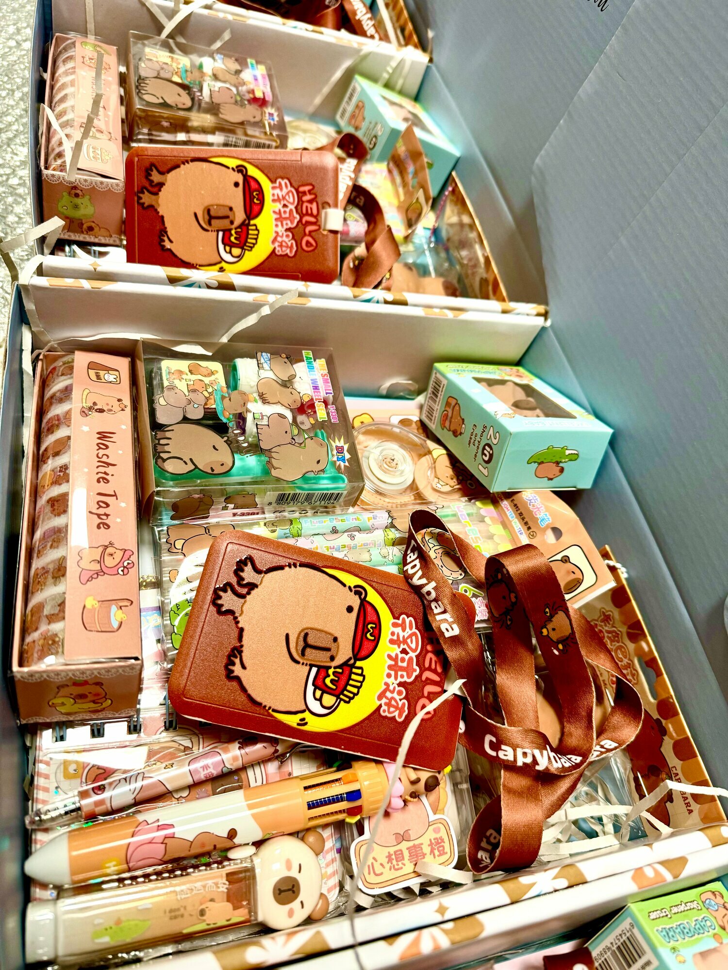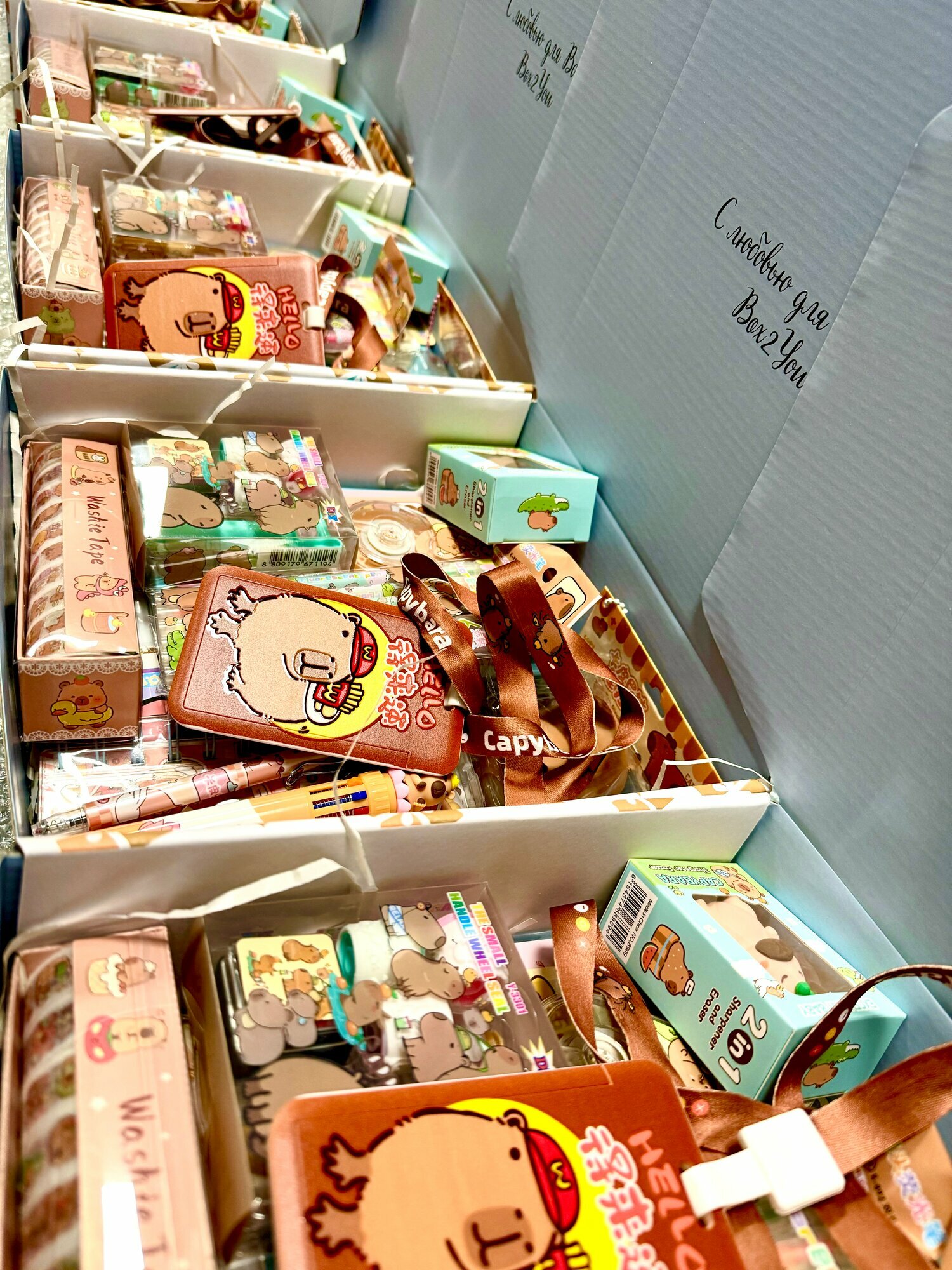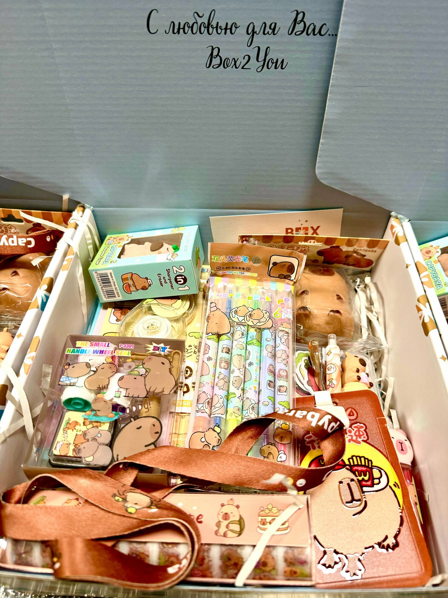 Набор канцелярии для школы в подарочной упаковке с рисунком Капибары создан специально для детей независимо от возраста и повода: будь то подарок на Новый год, День Рождения, подарок первокласснику на 1 сентября, в школу или детский сад. Всего в игровом подарочном наборе 19 предметов. Этот яркий сюрприз бокс для девочки и мальчика является ещё и полезным! Милая канцелярия ждет вас в подарочном наборе: набор фломастеров, большой яркий блокнот в клетку и мини блокнот для детских секретов, шариковая ручка с многоцветными стержнями, ручка клик-клак с изображением капибары, удобная линейка, различные стикеры, наклейки, магнитные закладки, фигурный ластик-точилка 2 в 1, автоматический ластик, набор блестящего скотча , замазка и клей станут главным украшением на письменном столе вашего ребёнка. А на школьный рюкзачок ребенок сможет повесить удобный детский бейдж на веревке для пропуска в школу. В наборе также есть развивающая водная расскраска, штамп с рисунком капибары и алмазная мозайка для полезного времяпрепровождения. И, конечно, никто не устоит перед милым сквишем Капибара, который также ожидает своего маленького хозяина в детском наборе игрушек. Качественная коробка из плотного картона декорирована фирменным логотипом Box2You, что делает ее праздничной и подходит для подарка на каждый праздник. Кроме того, бокс сюрприз с игрушками Капибара бережно сложен в транспортировочную коробку для безопасной перевозки до покупателя. Также наши детские подарочные боксы станут идеальным вариантом корпоративного подарка для садов, школ или для детей сотрудников на Новый год. Важно: Цвета предметов, входящих в состав набора, могут варьироваться в зависимости от партии и немного отличаться от фотографий на сайте! Приобретая готовый подарочный набор от Box2You в подарок, у Вас не будет необходимости ходить по магазинам - купить интересный готовый подарок для девочки можно уже у нас. Ни один ребёнок не останется равнодушным от такого прекрасного подарка на любой праздник!