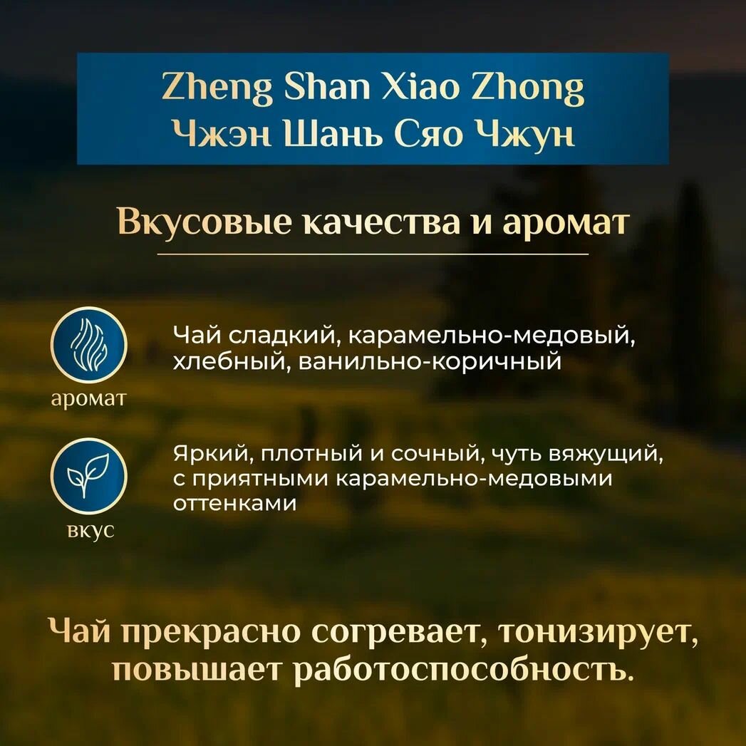 Набор порционного листового красного китайского чая сорта Чжэн Шань Сяо Чжун (Zheng Shan Xiao Zhong) - отличная и беспроигрышная идея для подарка как друзьям, так и коллегам, а также врачу, учителю, воспитателю, любому значимому человеку. Повод также может быть любой, будь то 8 марта, новый год, профессиональный праздник или просто знак внимания, когда идешь в гости. Данный набор содержит 18 порционных баночек чая. Поставляется в красивом подарочном футляре стильной и благородной расцветки зебрано с брендированным картонным пакетом в комплекте. Одной баночки чая хватит для полноценного чаепития в компании, на большой заварочный чайник. Китайский красный чай Чжэн Шань Сяо Чжун собирается на севере провинции Фуцзянь. Название переводится как «Малый Вид с Настоящих Гор». В процессе изготовления сяочжуны проходят операцию, которая называется «го хун го», что в переводе с китайского значит «прохождение красного котла». Это короткий, но интенсивный прогрев в 2-3 минуты при 200°С. Благодаря ему сяочжуны имеют характерный цвет листа и «огненный» вкус. Традиция изготовления сяочжунов насчитывает более пяти сотен лет. Аромат данного сорта чай сладкий, карамельно-медовый, хлебный, ванильно-коричный. Вкус яркий, плотный и сочный, чуть вяжущий, с приятными карамельно-медовыми оттенками. С каждым проливом вкус раскрывается волнами, от мягкого и нежного в начале до яркого, терпкого и крепкого в середине чаепития. Этот чай прекрасно согревает, тонизирует, повышает работоспособность. Сяо Чжун — один из самых неприхотливых и простых в заваривании видов чая. Используйте кипяток и хорошо прогрейте посуду перед засыпанием чайного листа. Настаивание сэкономит время и даст один вкус, но максимально проявленный. Способ приготовления чая проливами позволит получить несколько вкусов из одной заварки и раскрыть чай постепенно, с разных сторон. Для настаивания подойдёт любая чайная посуда — кружка, френч-пресс, стеклянный или фарфоровый чайник. Используйте пропорцию 1,5 г. на каждые 100 мл объёма воды. Промойте чай перед настаиванием для пробуждения аромата, залейте кипятком, подождите 3-4 минуты и чай будет готов!