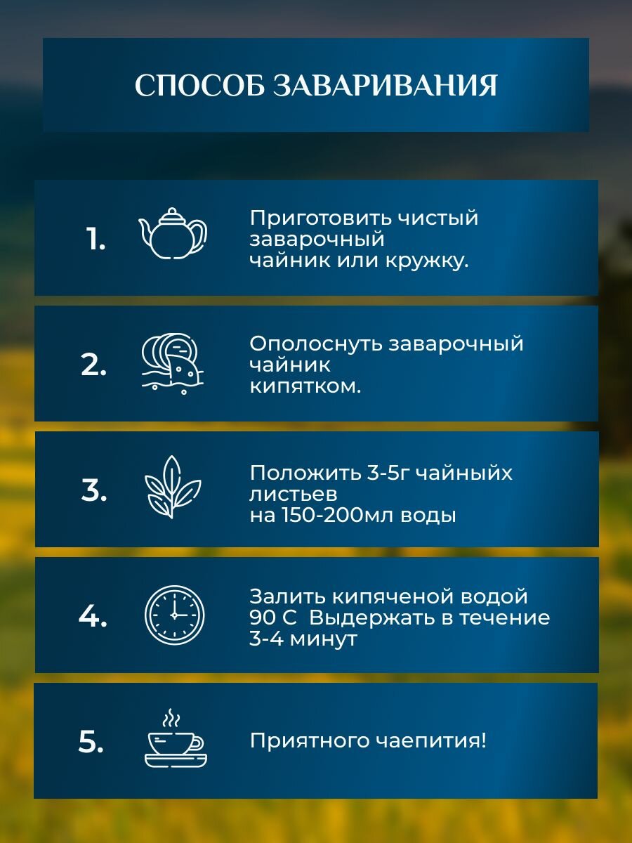 Для настаивания подойдёт любая чайная посуда — кружка, френч-пресс, стеклянный или фарфоровый чайник. Используйте пропорцию 1,5 г. на каждые 100 мл объёма воды. Промойте чай перед настаиванием для пробуждения аромата, залейте кипятком, подождите 3-4 минуты и чай будет готов!