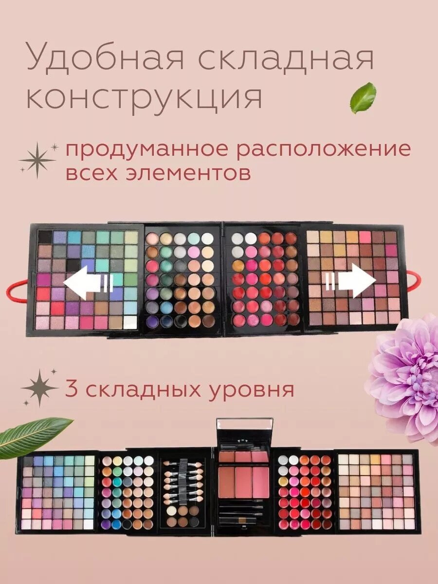 Большой косметический набор в крутом пластиковом чемоданчике прямоугольной формы - лучший суперподарок и креативный сюрприз для подружки и сестры, для начинающей пользоваться косметикой модницы - дочки, для мамочки, бабушки и жены, коллеги и учителя. 5 разных наборов с разным наполнением из множества предметов и средств для ухода укомплектованы по - разному, чтобы каждый мог найти подходящий именно ему чемоданчик. Сундучок (размер 26 см х 18 см х 9 см) наполнен всем самым необходимым для уходовых косметических процедур: скульптурирования лица, создания четкого контура, коррекции овала, скул и губ. Бьютибокс - косметичка укомплектован палетками с цветными тенями для век с разными оттенками пигмента, популярными оттенками румян, помадами для губ с приятной текстурой. Красивый чемодан оснащен контурными карандашами для губ и карандашами для подводки глаз или очерчивания контура бровей. Для ежедневного нанесения макияжа в наборе предусмотрены маленькие и большие кисти и кисточки разной формы для женских румян, теней и помады, ухода за волосками ресниц и бровей. Рrofessional - комплект содержит лаки для ногтей разных оттеков: ярких и пастельных. Чемоданчик с набором декоративной косметики может быть дополнен футляром - переноской с зеркалом для хранения теней, хайлайтером или корректором для beauty - визажа основы или базы для украшения, естественного блеска и сияния, для контуринга и скульптора. В комплекте пока нет маникюрного набора и туши для ресниц, но, возможно, они появятся позже. Дорожный чемодан с makeup - косметикой подойдет для визажиста, чтобы нанести нежный макияж и маникюр для выпускного, праздника или вечеринки как в салоне красоты. Стильный кейс - box в практичном дизайне удобен для путешествий и поездок. Необычный и чудесный сундучок в подарочной коробке - упаковке - отличный презент для взрослых женщин и девушек - подростков на день рождения, который подарит незабываемые эмоции, модный и функциональный набор для девочек, только начинающих знакомится с косметикой. У нас есть акции и распродажи, вы можете купить наши товары в подарок со скидкой!