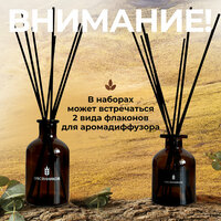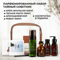 Набор косметики с аромадиффузором от бренда Овсянников серии «Тайный советник» включает в себя 6 предметов: крем-эмульсия 100 мл, пенное мыло 150 мл, стеклянный декоративный флакон, рефил с аромажидкостью 100 мл, 10 фибровых палочек и стильную косметичку.