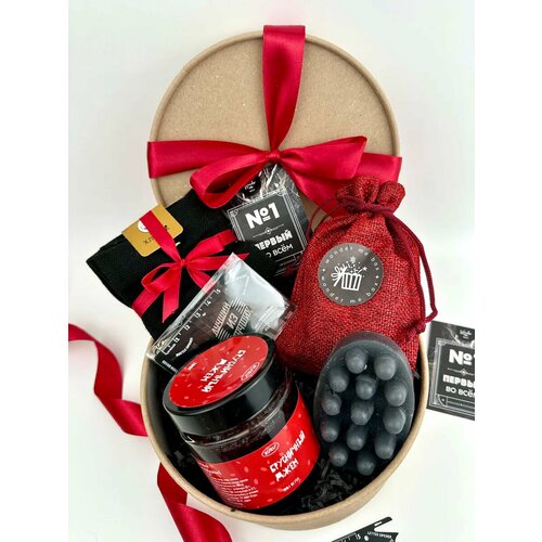 Состав набора удобно изучать на втором фото, внутри вы найдете: 1. Большая банка брусничного джема 250мл. 2. Крафтовое массажное мыло на нишевой отдушке в джутовом мешочке. 3. Швейцарский нож в форме карты. 4. Мужские носки. 5. Открытка с авторским дизайном для подписи и краткого пожелания. Для презентабельного вида все составляющие мужских подарков разложены на большом количестве наполнителя в коробке 19х19х9см, перевязаны атласной лентой и на время транспортировки обернуты пузырчатой пленкой.