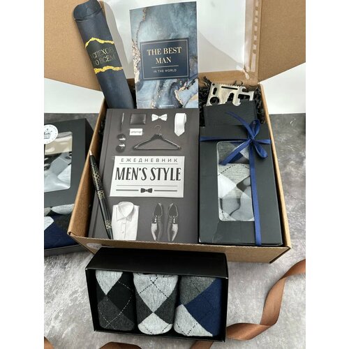 Состав набора удобно изучать на втором фото, внутри вы найдете: 1. Ежедневник со стилизованной обложкой. 2. Пишущая ручка в стилизованной упаковке. 3. Швейцарская карта в чехле. 4. Набор носочков. 5. Открытка с авторским дизайном для подписи и краткого пожелания. Для презентабельного вида все составляющие мужских подарков разложены на большом количестве наполнителя в коробке 25х25х10см, перевязаны атласной лентой и на время транспортировки обернуты пузырчатой пленкой.