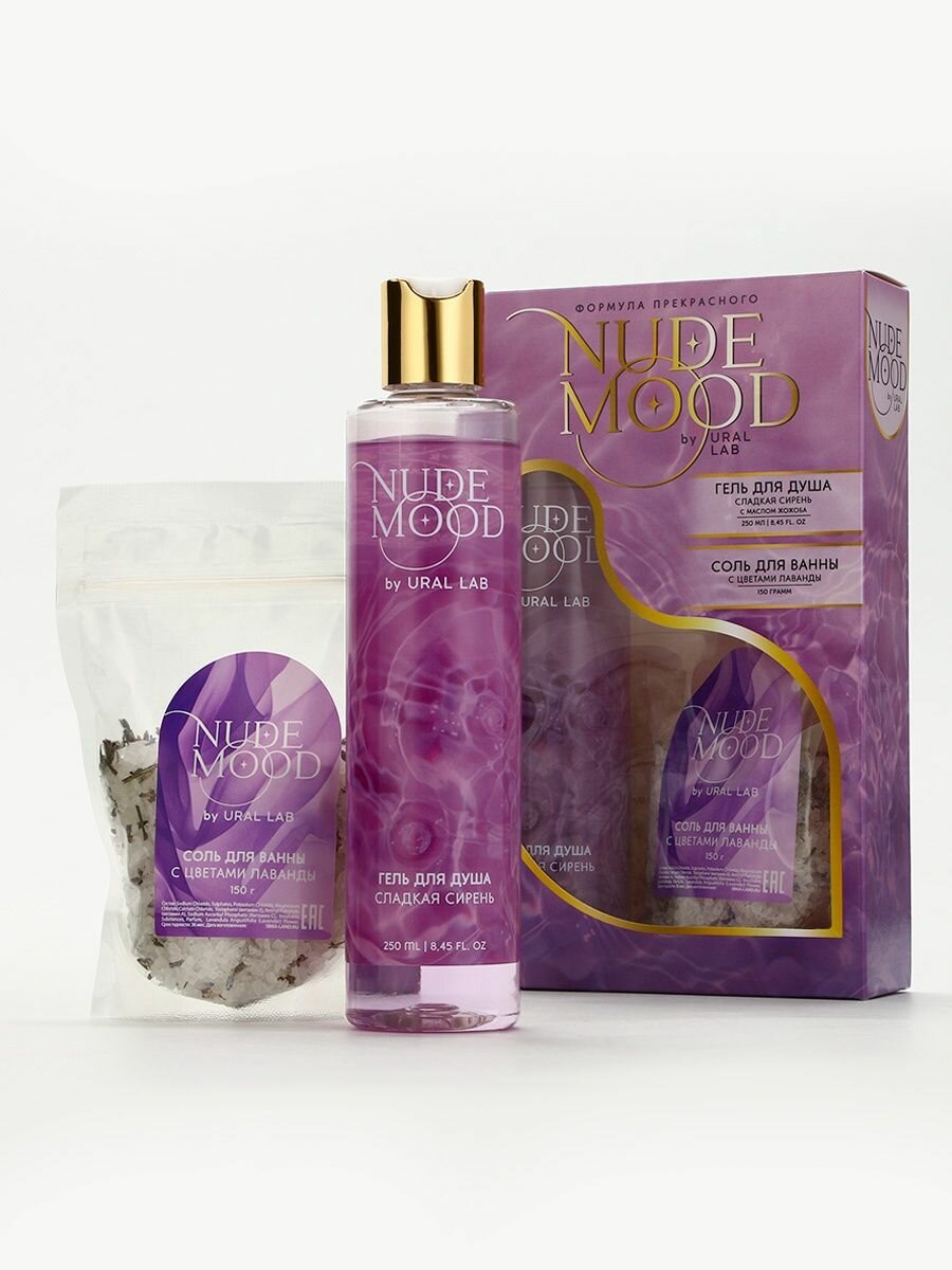 Подарочный набор NUDE MOOD, гель для душа 250 мл, аромат сирени и соль для ванны с лепестками лаванды 150 г: сравнение цен, характеристики, фото, актуальное наличие и цены.