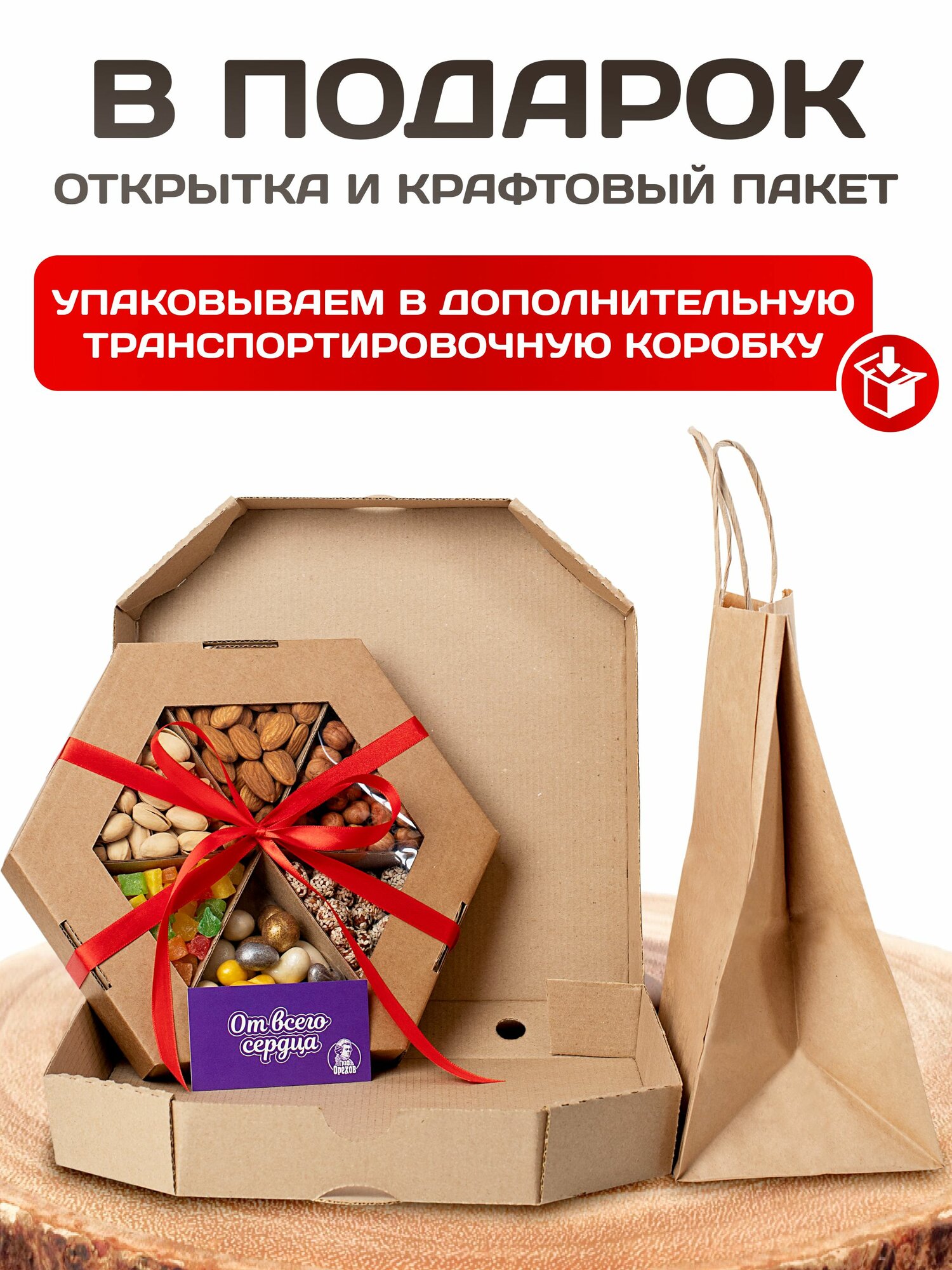 Подарочный набор сухофруктов и орехов - Граф Орехов. Вы получаете фирменную красивую коробку (с прозрачным окном), крафт пакет, в котором непосредственно и сможете все подарить, атласную ленту и открытку. Мы любим дарить праздник, настроение и качество.