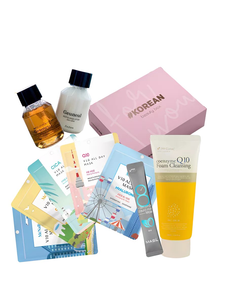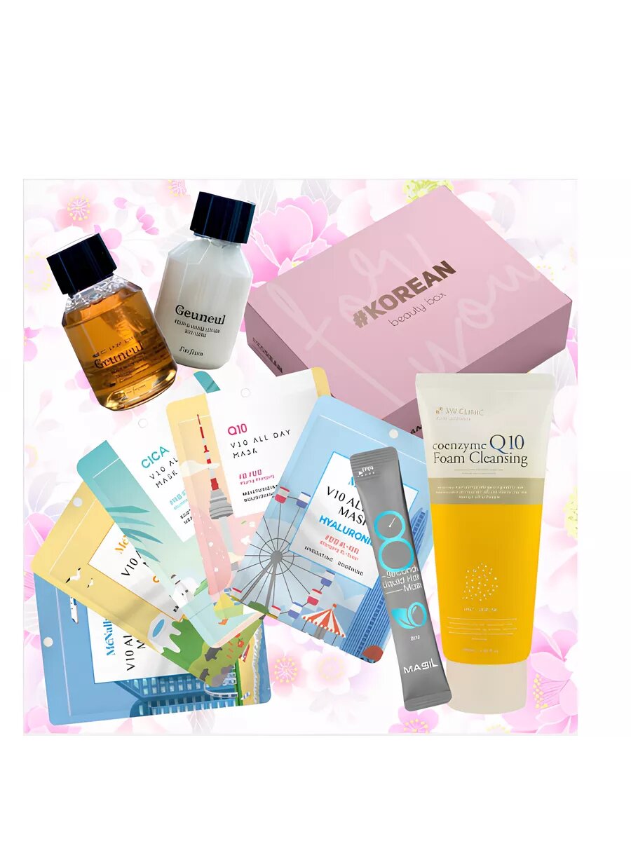 Коробка для подарка "For you" розовая, 22*16*8,5см McNally Набор ассорти тканевых масок для лица, 25мл х 5шт 3W Clinic Пенка для умывания с коэнзимом Q10, 100мл I'm from Набор для тела, 1шт Masil Саше в ассортименте, 8мл