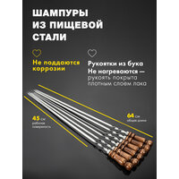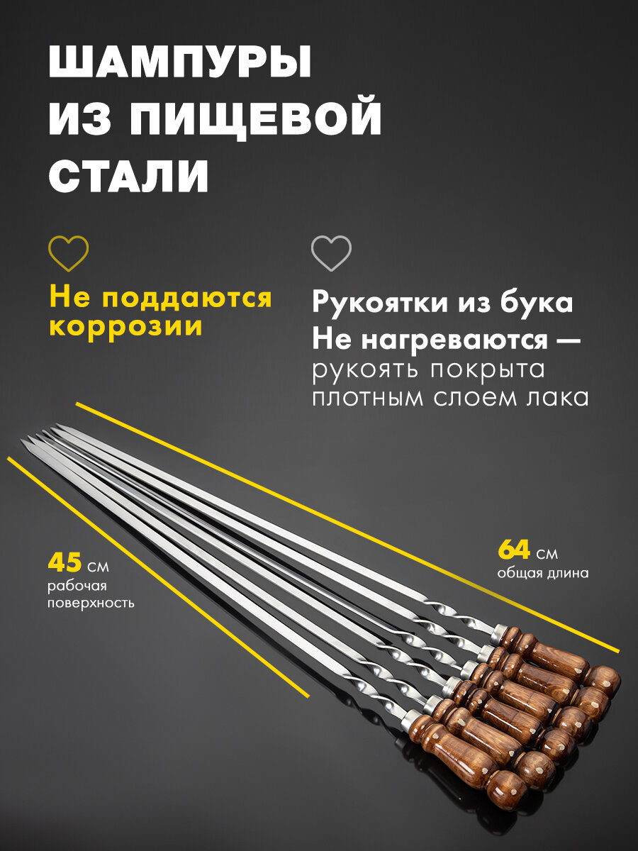 Шампуры сделаны из пищевой нержавеющей стали марки AiSi430. Деревянные рукоятки не нагреваются, покрыты огнеупорной пропиткой. Подойдут для барбекю на любом мангале.