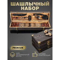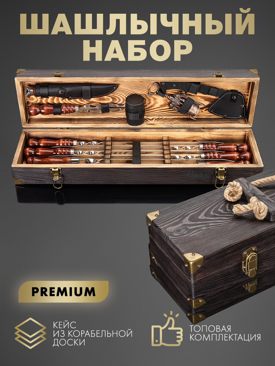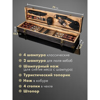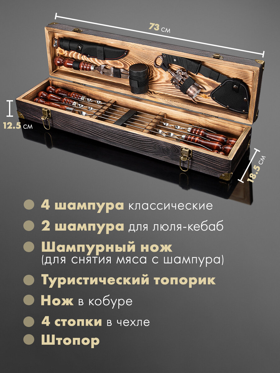 * Кейс (ящик) из массива берёзы - 1 шт * Шампуры с деревянными ручками 6 шт * Двойной шампур-вилка - 1 шт * Шашлычный нож (для снятия мяса с шампура) - 1 шт * Кочерга - 1 шт * Таганок (складной мангал) - 1 шт * упаковка - 1 шт