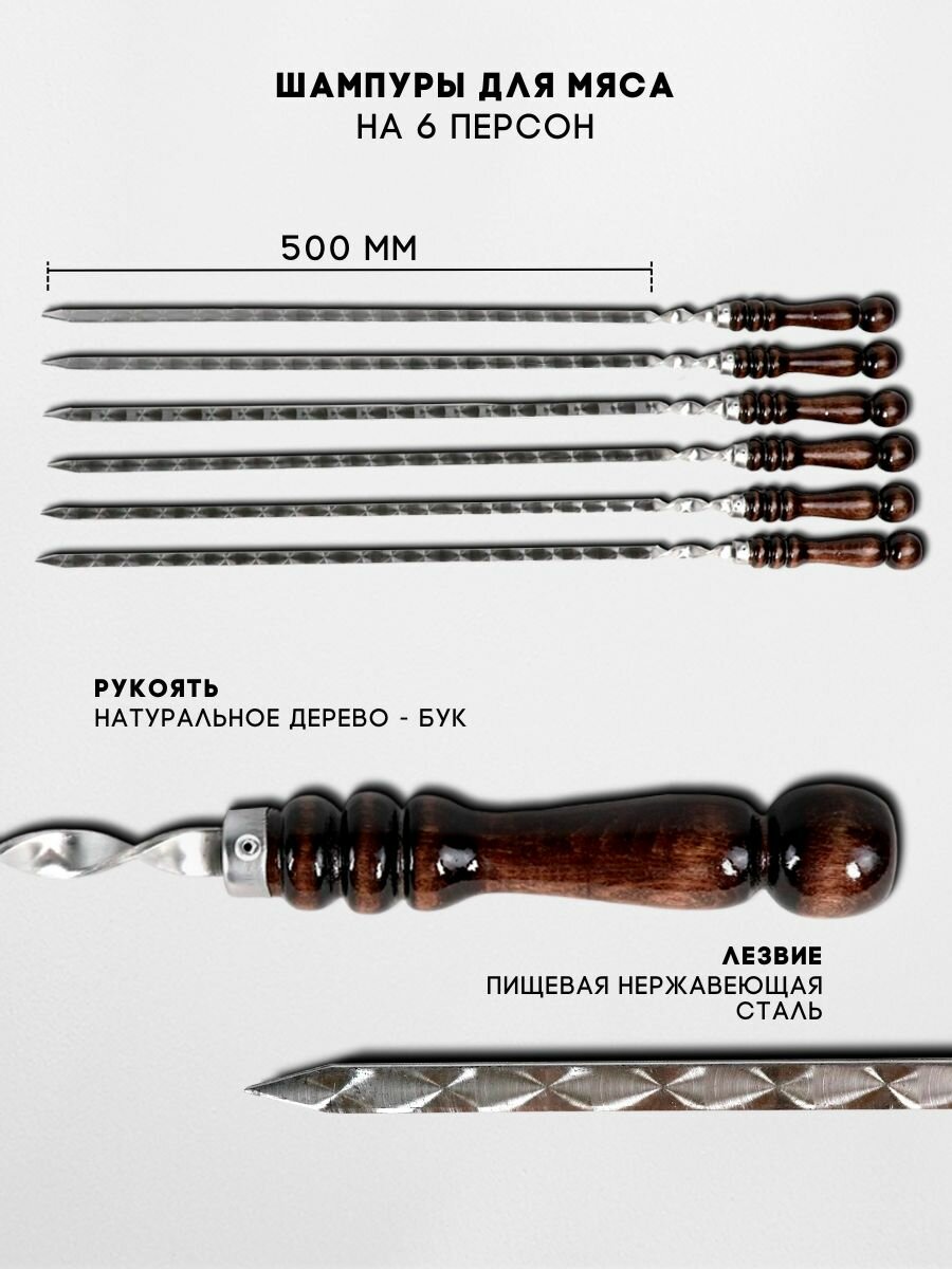 | Подробная комплектация | В набор шампуров входит: - 6 шампуров с деревянными ручками - Таганок (раскладной мангал) - Кизлярский нож и топорик - Вилка для снятия мяса - Фляга - 4 стопки - Открывалка-штопор |