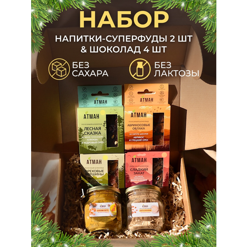 Подарочный набор сладостей и чая от атман – настоящий кладезь для тех, кто ценит здоровый образ жизни и не готов отказываться от удовольствий. В нем вы найдете идеальное сочетание бодрящих напитков-суперфудов и восхитительного пп шоколада, без сахара!