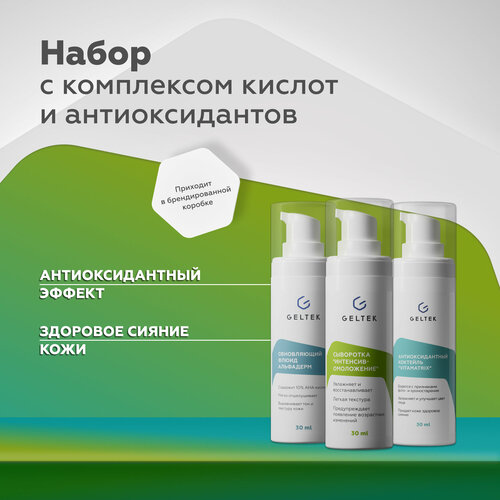 Набор средств для здоровой, отдохнувшей, светящейся изнутри кожи! Набор средств для здоровой, отдохнувшей, светящейся изнутри кожи! Обновляющий флюид Альфадерм содержит в составе АНА-кислоты и имеет текстуру oil-free. Стимулирует естественное отшелушивание отмертвевших частичек кожи, уменьшает пигментацию (в том числе и поствоспалительную), препятствует образованию комедонов и воспалений. Антиоксидантный коктейль VitaMatrix имеет текстуру легкой крем-сыворотки. Обогащен мощнейшими антиоксидантами, такими как витамин А, витамин С, витамин Е, которые придают коже здоровое сияние, нейтрализуют действие свободных радикалов, предотвращают старение. Гиалуроновая кислота препятствует потере влаги, восстанавливает защитный барьер. Средство обеспечивает светоотражающий эффект «SoftFocus», благодаря которому выравнивается тон кожи, а мелкие несовершенства становятся менее заметными. Легкая гелевая сыворотка Интенсив-омоложение содержит два вида гиалуроновой кислоты и подходит для всех типов кожи. Служит отличным увлажнителем для сухой кожи, а на жирной нормализует работу сальных желёз. Также средство повышает иммунитет кожи и разглаживает мелкие морщины, вызванные сухостью и обезвоженностью. Пошаговая инструкцияПротокол совместного примененияШаг 1: Утром после очищения и тонизации, нанести на лицо, шею и декольте сыворотку «Интенсив-омоложение" ираспределить до полного впитывания. Шаг 2: Далее нанести и распределить легкими массажными движениями антиоксидантный коктейль VitaMatrix . Шаг 3: Вечером после очищения и тонизации, нанести флюид Альфадерм в небольшом количестве, распределитьпо коже до полного впитывания, избегая зон вокруг глаз и губ. В летнее время применять флюидпредпочтительнее только вечером, а днём необходимо средство с SPF. Гельтек - это профессиональная косметика для косметологов и домашнего ухода, специалисты компании занимаются разработкой и выпуском продукции, такой как сыворотка гель крем флюид тоник маска. Продукция используется для УЗ кавитации микротоков RF-лифтинга ионофореза алмазной дермабразии гальванизации дезинкрустации лазерной терапии массажа миостимуляции обертывания ультразвуковой терапии ультразвукового пилинга фонофорез электропорации холодного распаривания, а также для профессионального и домашнего и ухода. Вся продукция направлена на улучшение состояния кожи - антицеллюлитная поросужающая увлажняющая матирующая тонизирующая против акне против морщин разглаживающая.