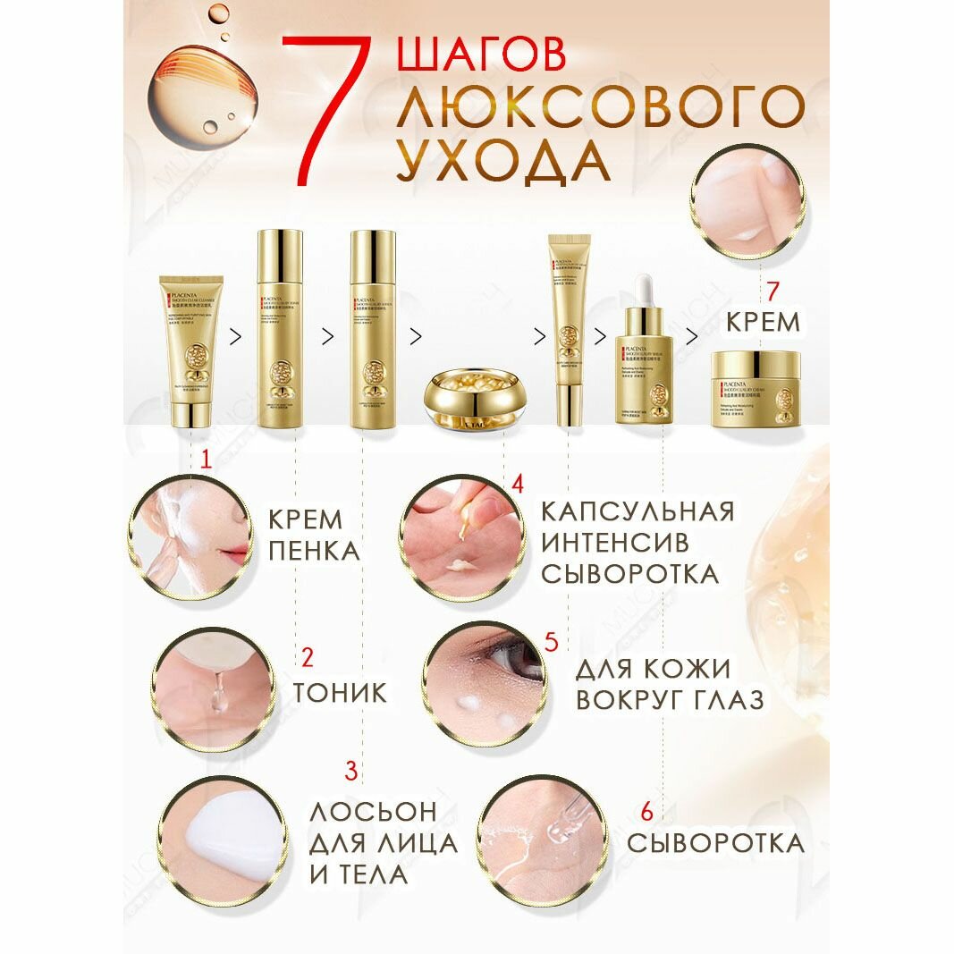 | В наборе | ШАГ 1. Очищающая крем-пенка для умывания - 100 г.: ШАГ 2. Освежающий тоник - 100 мл.: ШАГ 3. Лосьон для лица и тела - 100 мл.: ШАГ 4. Капсульная интенсив-сыворотка – 30 шт. по 0,34 гр. ШАГ 5. Крем для кожи вокруг глаз – 20 гр. ШАГ 6. Сыворотка – 30 мл. ШАГ 7. Увлажняющий крем – 50 гр. |