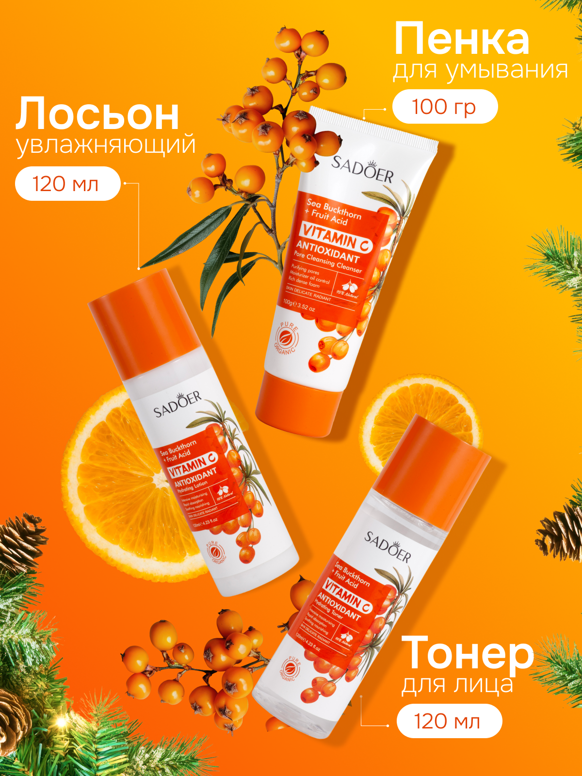 Косметический набор средств для ежедневного ухода за кожей лица от бренда SADOER. В основе три мощных компонента против возрастных изменений. Масло облепихи - активно обогащает витаминами, тонизирует и подтягивает кожу, ускоряет регенерацию клеток, устраняя шелушение и стянутость. Витамин С - мощный природный антиоксидант - улучшает защитную функцию кожи, осветляет пигментные пятна и постакне, стимулирует синтез коллагена, повышая эластичность кожи. Гиалуроновая кислота глубоко увлажняет, омолаживает и удерживает влагу.