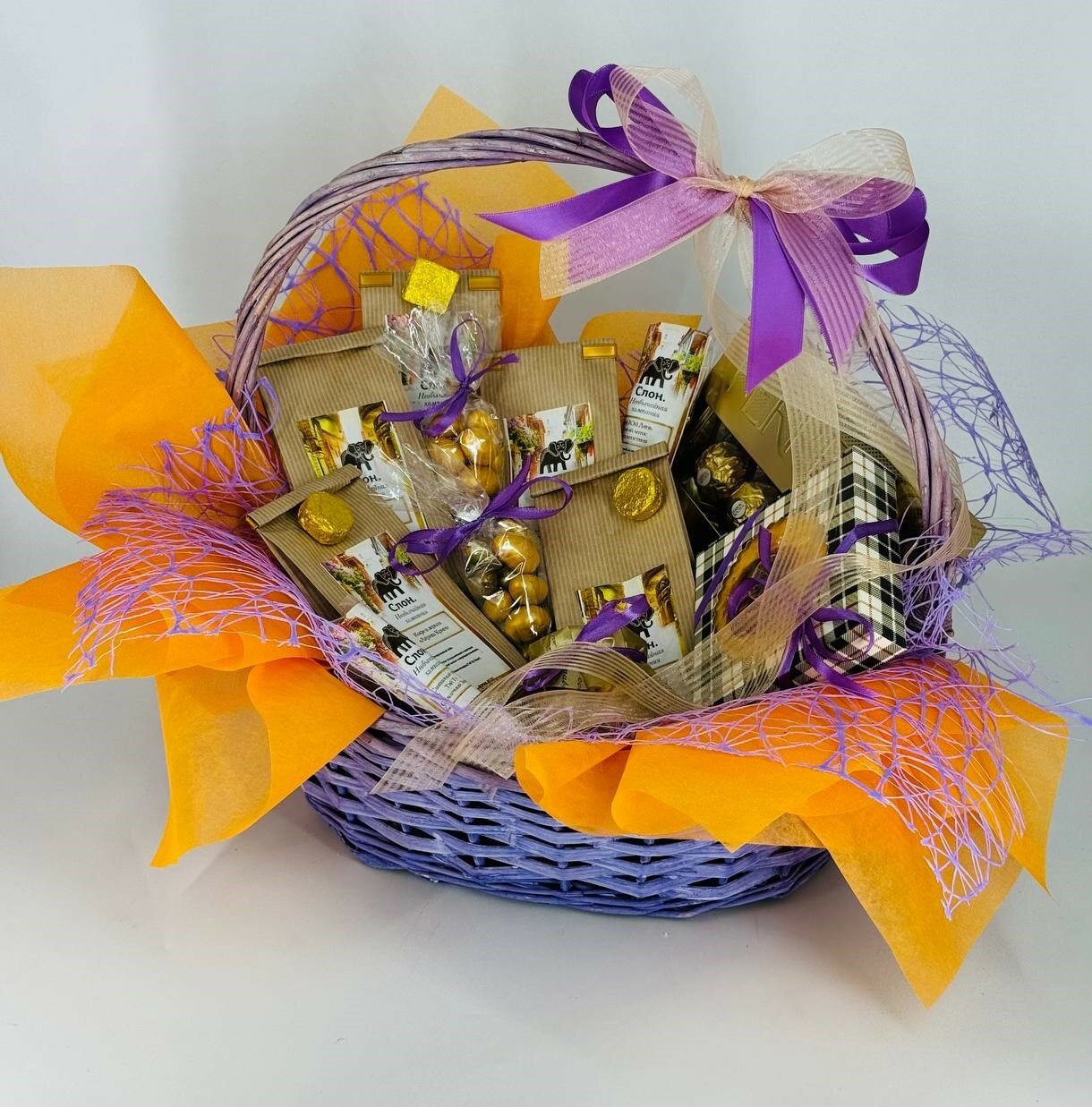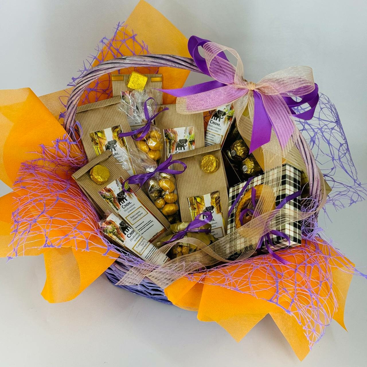 Купить Подарочный набор в корзине из элитного чая и зернового кофе с конфетами и орехами в бельгийском шоколаде. Подарок на Пасху, Рамадан, День рождения, 8 марта с доставкой по всей России.