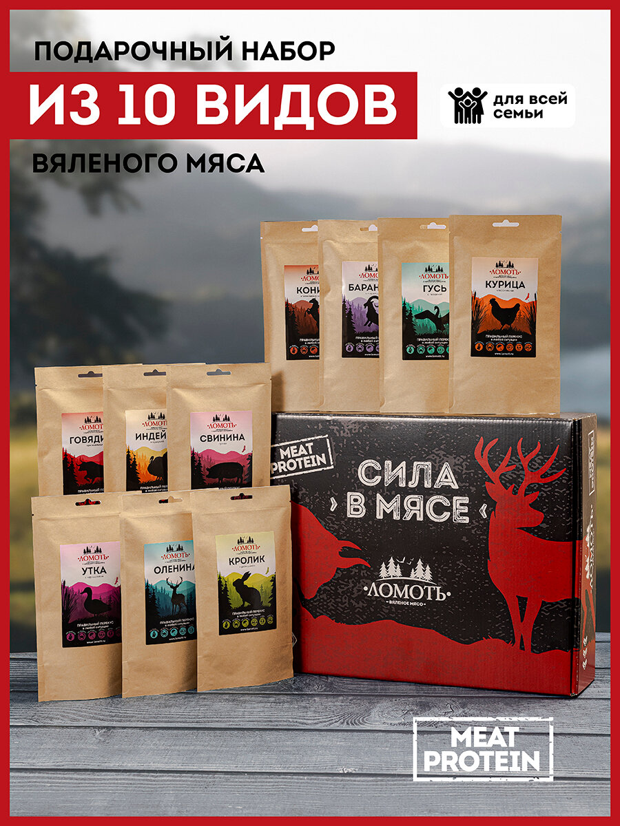 Подарочный набор Вяленое мясо «сила В мясе» ТМ Ломоть 10 видов мяса по 40 грамм: сравнение цен, характеристики, фото, актуальное наличие и цены.