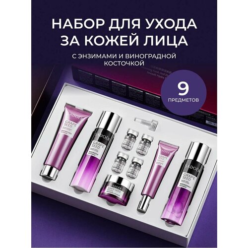 Красивый подарочный набор уходовой косметики с экстрактом виноградных косточек от бренда SADOER - эффективный комплекс для ежедневного применения. В набор входит 6 средств: пенка для умывания, тоник, сыворотка (4 штуки), эмульсия, крем против морщин и крем для кожи вокруг глаз. Основной компонент косметических средств - фермент виноградных косточек, который оказывает антиоксидантные свойства, стимулирует синтез коллагена и эластина, борется с возрастными изменениями, а также обладает противовоспалительным действием, снимает раздражение и защищает от вредного воздействия окружающей среды. В состав также входят: экстракт центеллы азиатской, экстракт семян лотоса и другие активные питательные компоненты, которые активно заботятся о коже. Средства в наборе дополняют друг друга, чтобы обеспечить оптимальные результаты ухода за кожей. Бережно относящиеся к коже средства очищают ее от макияжа и загрязнений, уменьшают выраженность морщин, укрепляют контур, глубоко увлажняют кожу и выравнивают ее тон, устраняют отечность, улучшают тонус, осветляют пигментацию и способствуют ее восстановлению. Набор косметики для ухода в красивой подарочной коробке - прекрасный способ показать свою заботу и внимание близким людям.