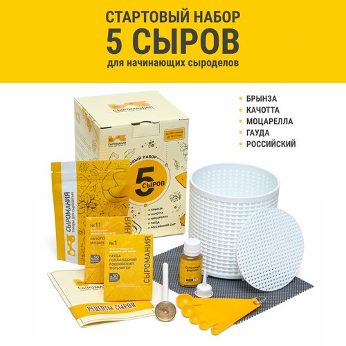 Стартовый набор для приготовления "5 сыров" позволяет начинающим сыроделам приготовить первые сыры. Набор для приготовления домашнего сыра рассчитан на 100 л молока, из которых можно приготовить до 10 кг сыра.