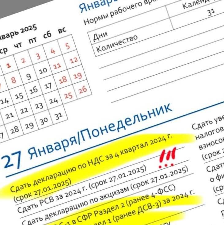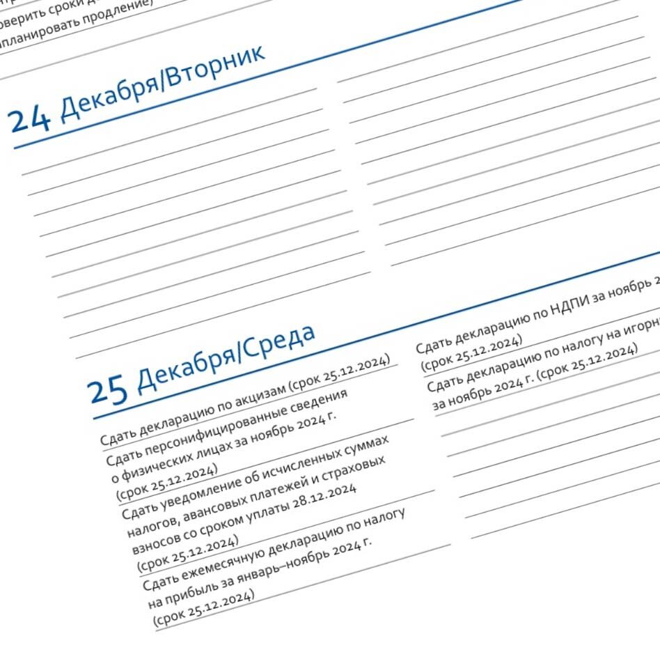 В ежедневнике учтены все последние изменения сроков оплаты налогов и сдачи отчетности на 2025 год.