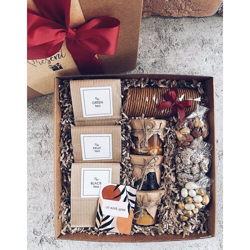 Этот стильный и солидный подарочный набор с чаем и различными вкусностями просто идеален в качестве подарка на любой праздник! За счет своей нейтральной цветовой гаммы и оформлению он подойдет к любому поводу - день рождения свадьба годовщина юбилей день учителя новоселье выпускной. Вкусные и оригинальные компоненты будут высоко оценены получателем! В составе: три различных вида натурального листового чая (черный чай, зеленый чай, фруктовый чай), ориганальное имбирное печенье, три вида орешков для вкусного и полезного перекуса - жареный микс кешью, миндаль, фундук, кешью с медом и кунжутом, арахис в карамели, наши топовые компоненты: соленая карамель с арахисом, натуральная арахисовая паста, клюквенный джем с грецким орехом, душевная открыточка "с наилучшими пожеланиями", на которой можно оставить свою надпись на память. Все это в эффектном оформлении с лентой и бантом. Порадуйте любимого классного руководителя начальных и старших клаcсов, завуча, репетитора, тренера, воспитателя няню детского сада, директора школы на экзамен, окончание конец учебного года. Получить такой презент будет приятно педагогу в институте, университете, колледже, техникуме и просто сладкоешке к приятному чаепитию. Универсальный и в то же время особенный он может быть женский и мужской, понравится подруге маме бабушке папе другу сестре любимой. Знак благодарности за заботу и внимание детям от родителей и учеников преподавателю истории музыки литературы русского языка географии и других предметов. Достойный и практичный, не стыдно дарить руководителю начальнику шефу боссу директору. Размер - 25х25х10см. Каждая коробка дополнительно упакована в защитную пупырчатую пленку и экологичный плотный картон, для обеспечения 100% безопасности транспортировки. Улыбки, радость и хорошее настроение гарантированы !