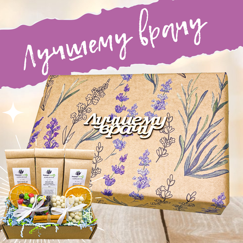 Состав набора: 3 вида рассыпного чая по 50 г, арахис в цветной шоколадной глазури (60 г), изюм в белой шоколадной глазури (60 г), две дольки апельсина, связка корицы, деревянная открытка.