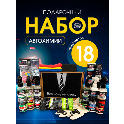 Набор автомобилиста - оригинальный и практичный подарок. Автотовары можно подарить мужчине, мужу, коллеге, сыну, отцу на день рождения, юбилей или порадовать себя и близких без повода. Подарочный набор автонабор для ухода за автомобилем подойдет для повседневного использования, которой пригодится каждому владельцу авто. В комплекте 18 предметов премиальной автокосметики. В дорожный набор входят очиститель стекол, очиститель винила, полироль для фар, экспресс-полироль, очиститель универсальный, антизапотеватель, влажные салфетки для чистки салона, полироль для приборной панели. Также в нем имеются тряпки из микрофибры для протирки пыли, 2 ароматизатора с приятным ароматом и губка для чернения шин, губка для ухода за пластиком, перчатки хб, заглушки для ремня безопасности 2 шт. С их помощью можно быстро помыть бампер, зеркала, пластик и багажник машины. Автомобильные средства с антистатическим эффектом придадут блеск при полировке, восстановят внешний вид покрытия, и кроме того - не окажут раздражающего воздействия на кожу рук.