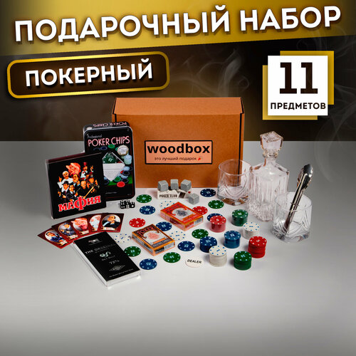 Состав подарочного набора "Покерный": покерный набор, 100 фишек с номиналом, 2 колоды игральных карт для покера (premium), 5 покерных кубиков, штоф для крепких напитков, 2 стакана для виски и алкогольных напитков (320ml), камни для виски, щипчики, мафия, премиальный шоколад bucheron (горький), подарочная крафт коробка