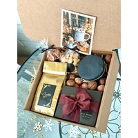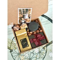 Идеальный подарок Вашему Мужчине на 23 февраля, День Рождения или как знак внимания, что Он есть! Ароматный кофе с шоколадом и орешками в течение дня с мыслями о Вас - это бесценно! Внутри набора: ▪конфеты ручной работы из Бельгийского шоколада 6 вкусов (молочный, белый, темный, лимонный, апельсиновый, рубиновый шоколад) ▪мед-суфле ▪ароматный молотый кофе ▪жареный фундук и миндаль ▪открытка с Вашими пожеланиями